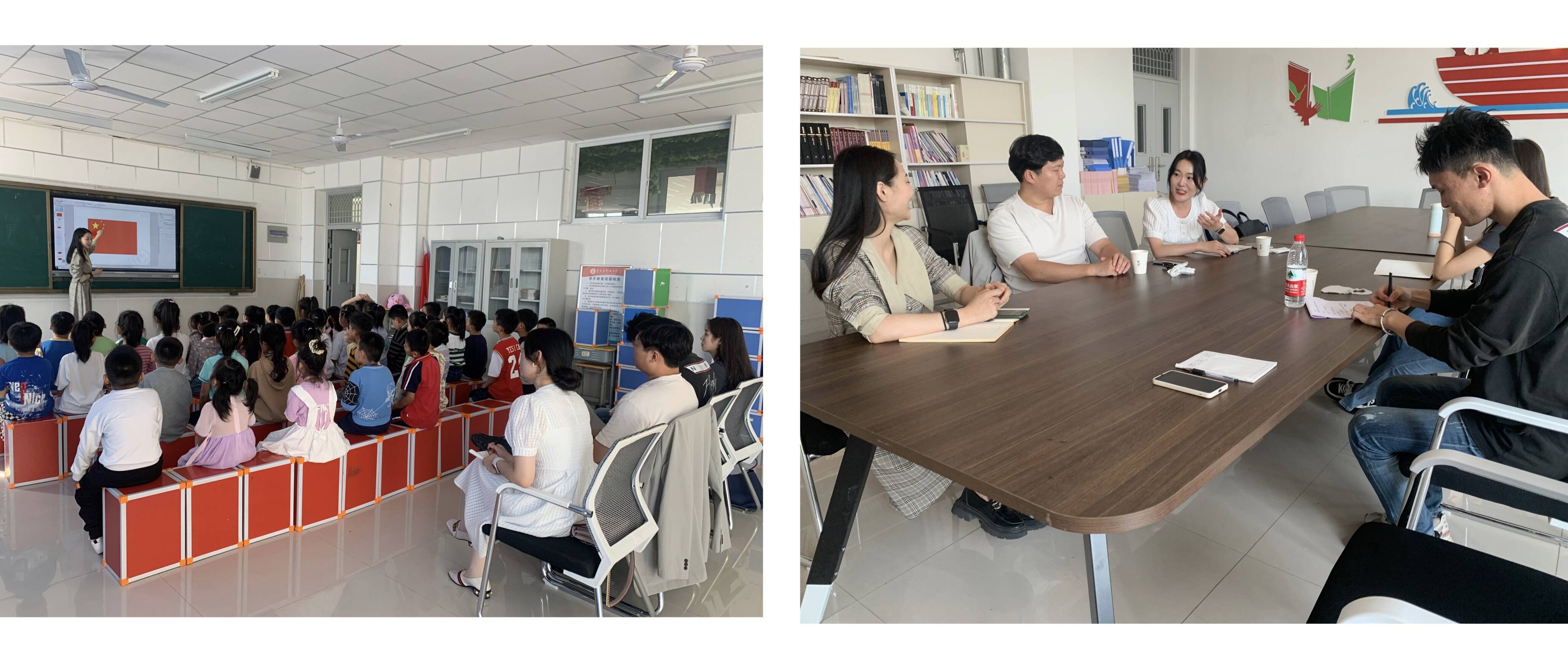 在成德小学五年级的音乐课堂,音乐学院专任教师小组在听课观摩之后对此进行教学研讨,并对教师的课程导入、节奏教学、律动训练、课程设置等问题提出建设性意见。