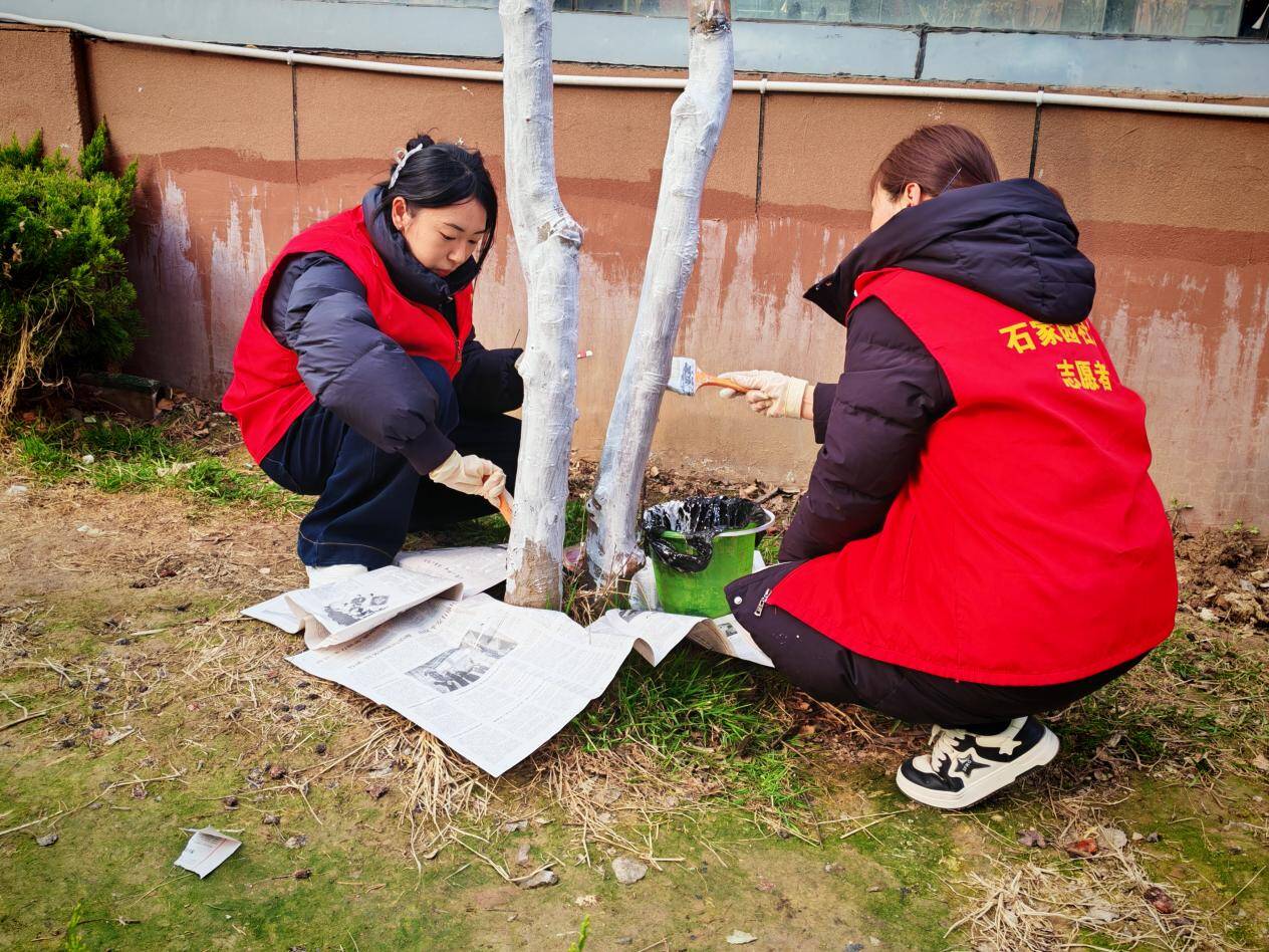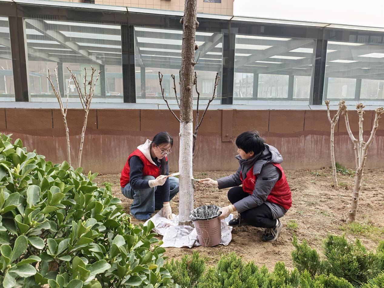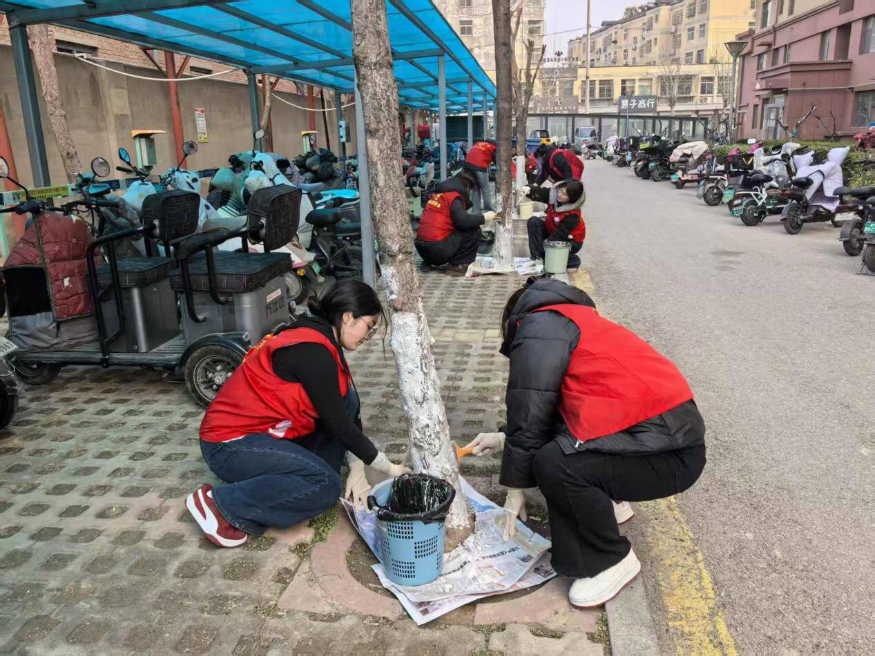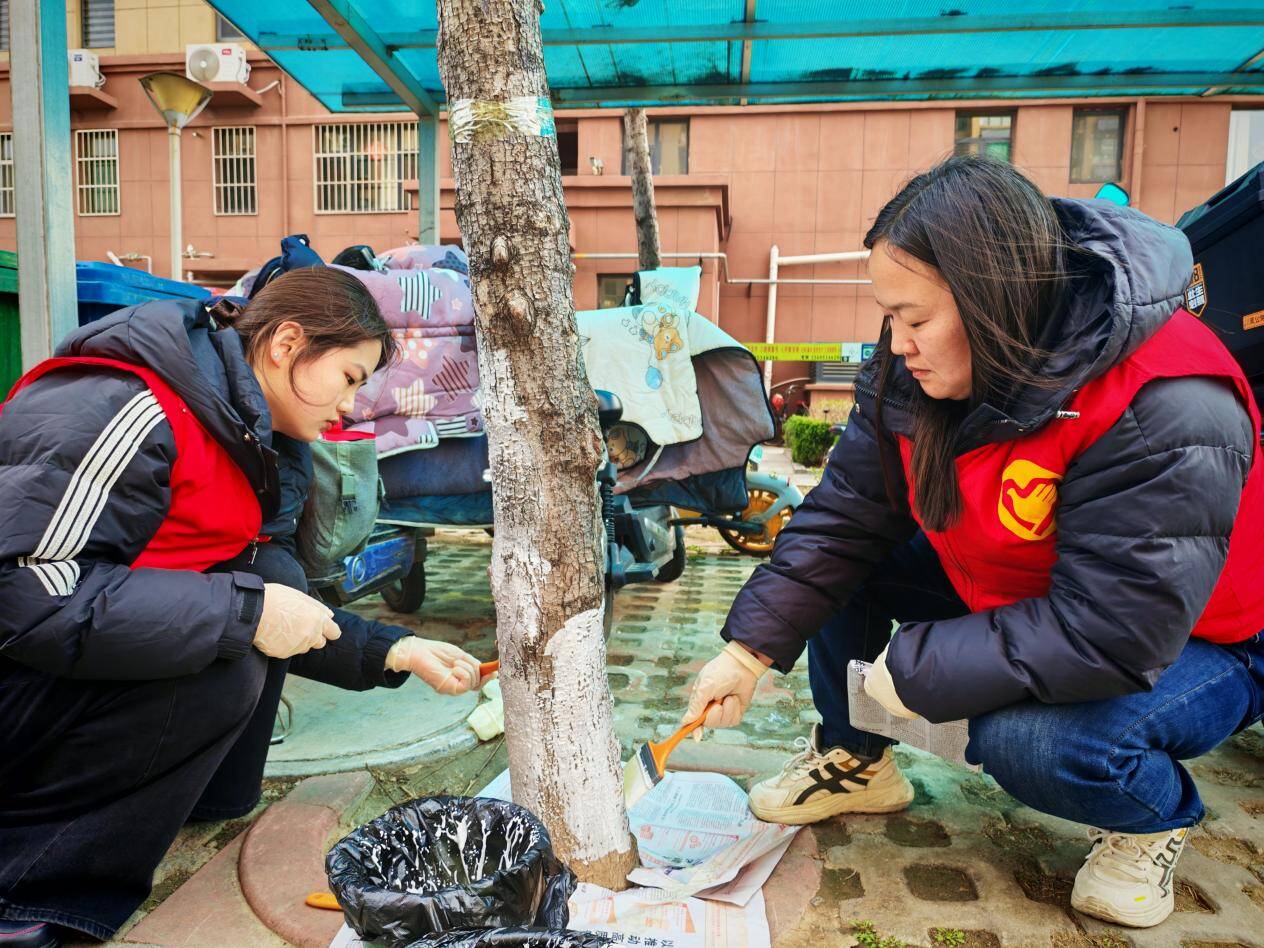 社区工作人员详细讲解树干涂白的技术要点与生态意义后,志愿者们分组协作,清理树穴杂物,调配涂白剂,为树木涂抹防护涂料等工作有条不紊进行,经过3小时的辛勤劳动,小区内60余棵行道树穿上了整齐的“白色新装”,既提升了小区绿化美观度,又为树木筑牢了“健康防线”。