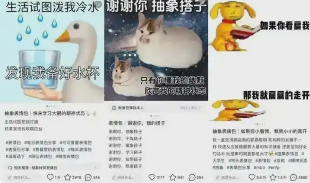 “抽象”还为年轻人提供了一个展现自我、发挥创造力的平台。“抽象”的内容往往具有反常规、反规则的特点,他们可以不受常规思维和表达方式的限制,自由地创造出各种荒诞、戏谑的内容,创造属于自己的文化符号,体现年轻人对生活的独特理解和个性化的表达。
