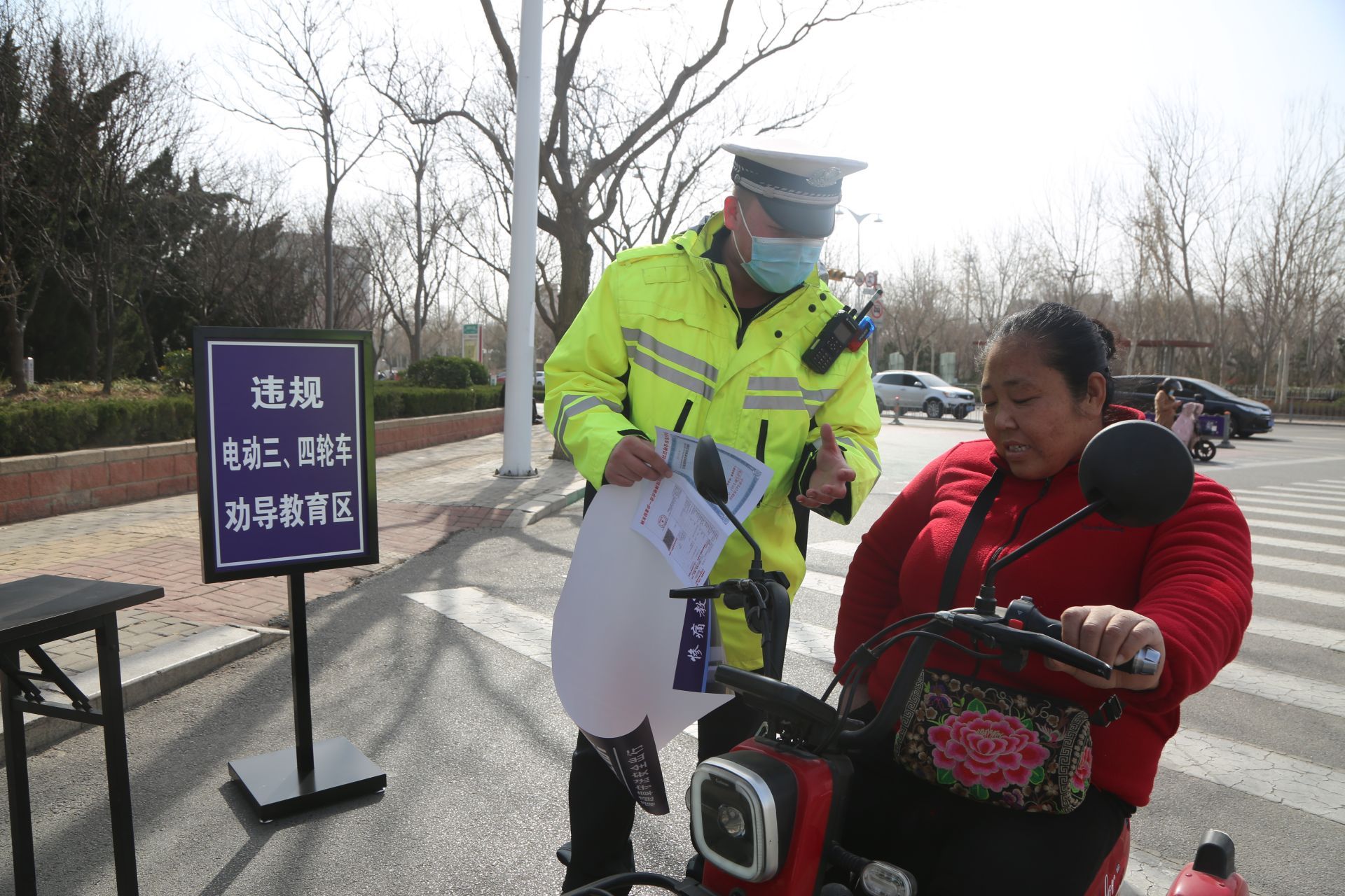 在双魏大街与新河路交叉口,市公安局交警支队直属一大队设置的文明交通宣传教育劝导点上,悬挂着大幅违规电动三轮四轮车交通隐患宣传海报,桌面上摆放着宣传彩页,红色小音箱不间断播放宣传音频。市公安局交警支队机关民警与大队民警一道,依托点位对于过往电动三轮四轮车驾驶人进行宣传。