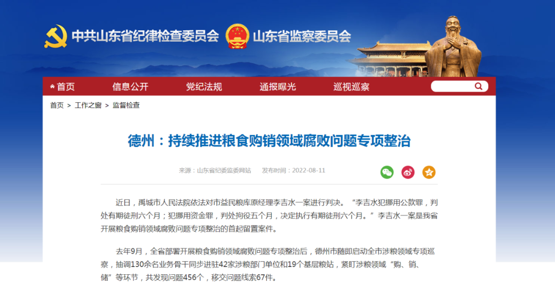 8月11日,山东省纪委监委网站刊发稿件《德州:持续推进粮食购销领域腐败问题专项整治》,介绍德州市纪委监委开展粮食购销领域腐败问题专项整治工作的经验做法。