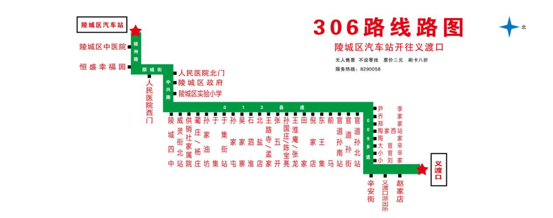 运营线路:陵城区汽车站、陵州路、颜城街、中兴路、威灵街、007乡道、013县道、009县道、义渡口,返程亦同;