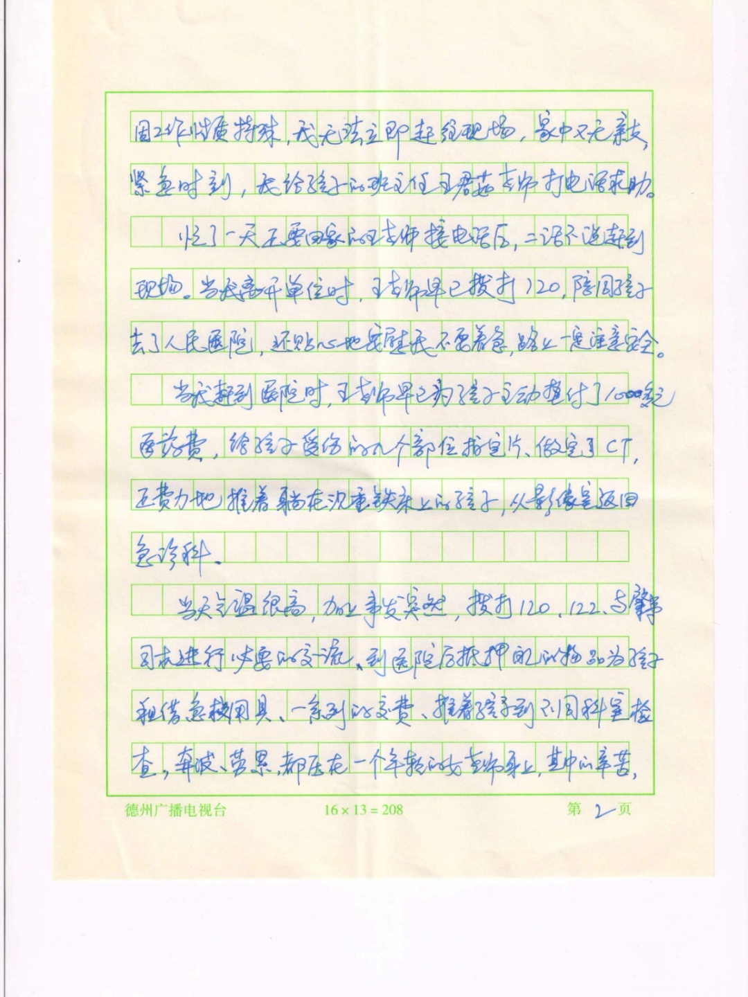 6月25日,德州九中八年级32班的李念璟同学在学校附近发生车祸,被一辆SUV意外撞倒,有目击者给孩子母亲打去电话,但是由于工作性质特殊,她无法立即赶到现场,随即向孩子的班主任老师求助。王君茹老师立即赶到现场,处理相关事宜,拨打120,陪同孩子到医院做各种检查和治疗,并垫付了医药费,直到孩子的家人纷纷赶到医院,检查结果出来以后,老师才放心离开。