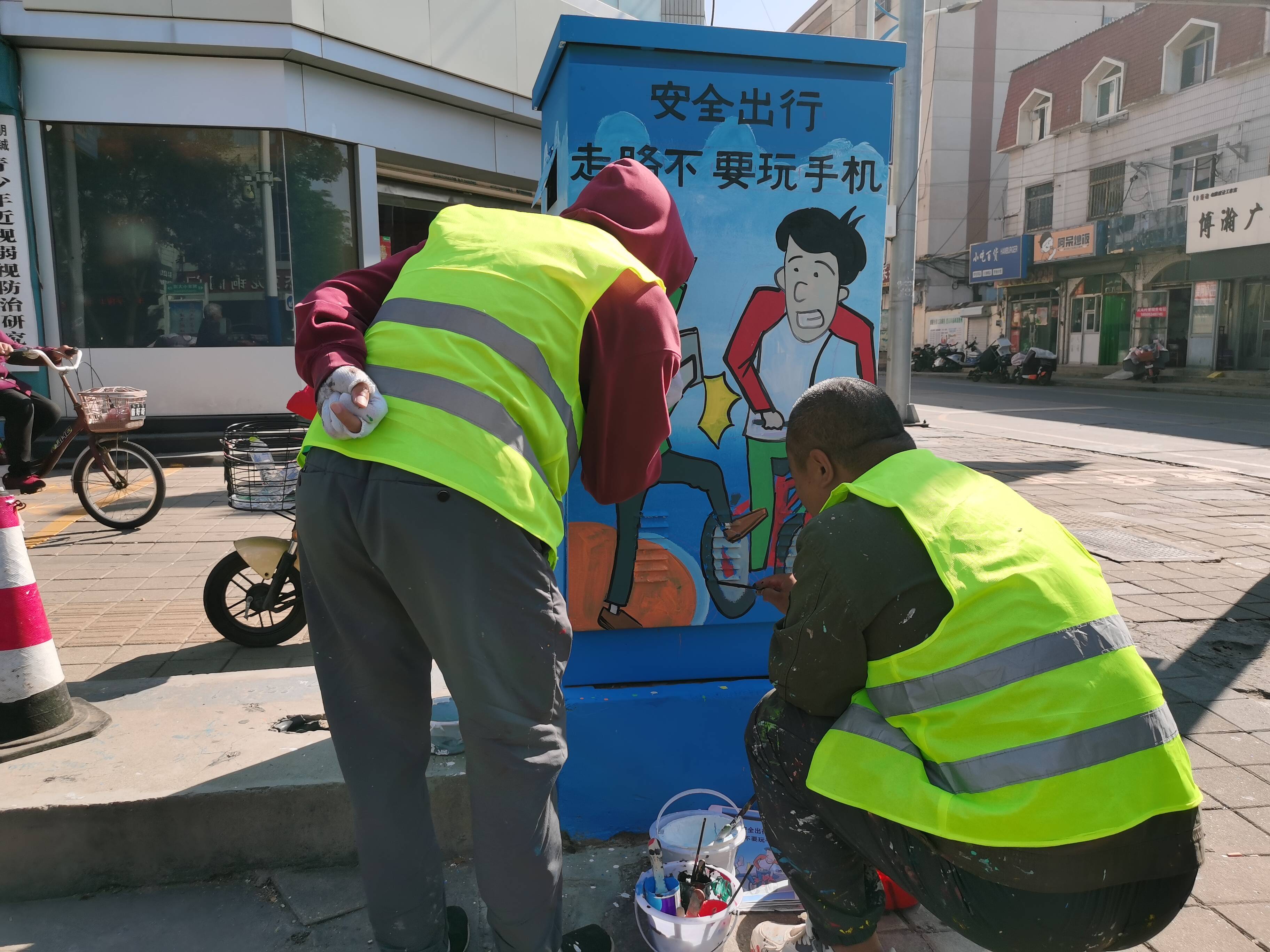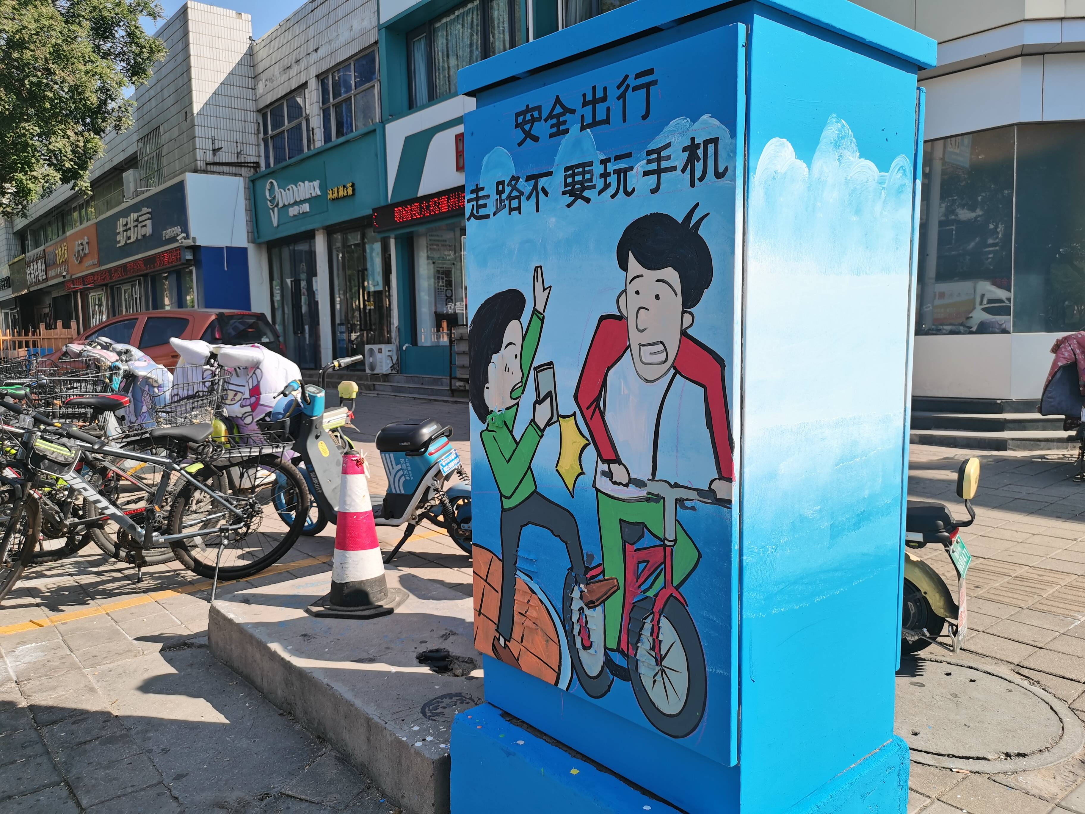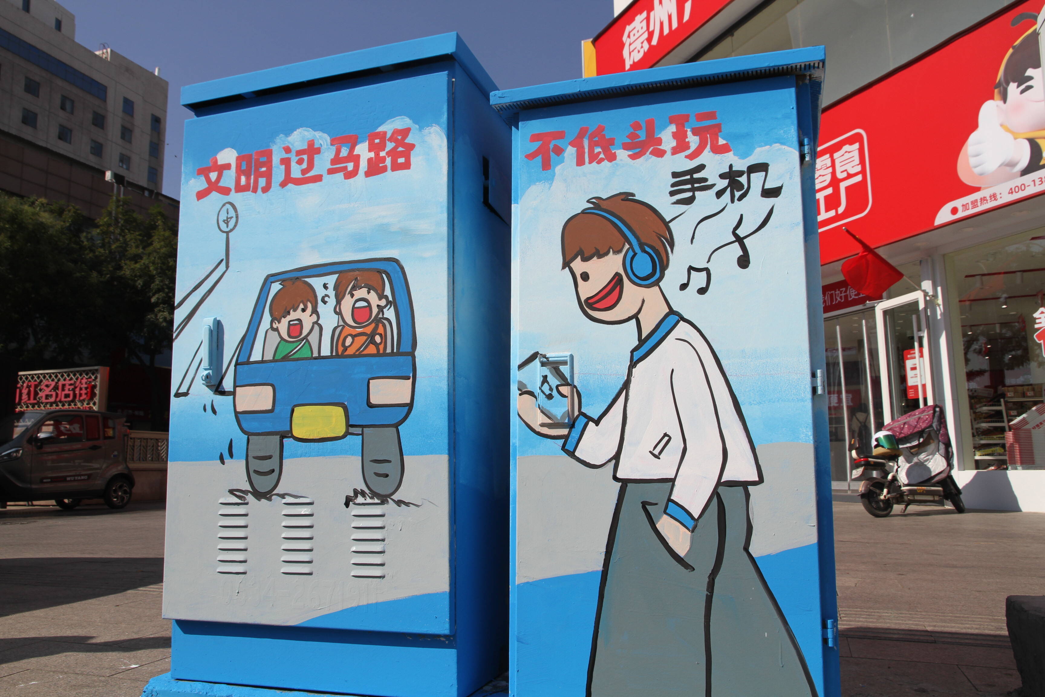 “文明过马路、不低头玩手机、请勿闯红灯……”10月10日,在德城区部分路口的交通信号灯灯箱上出现了手绘版交通安全漫画,醒目的交通安全警示语句与生动的手绘漫画相互衬托,构成了一幅别样风景。