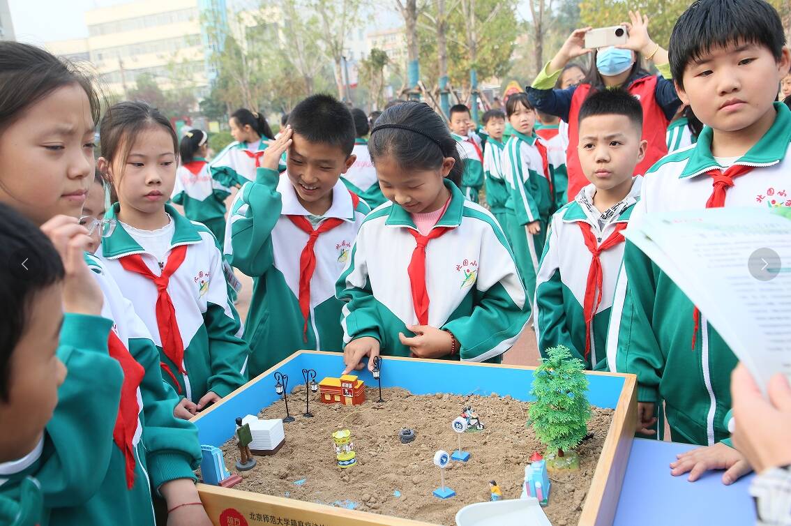 活动现场,德州一中心理健康教育中心主任张兰菊带领北园小学的孩子们体验了生动有趣的沙盘游戏,孩子们纷纷围在沙盘前,选择自己喜欢的玩具并认真地摆放,感受其中的魅力。
