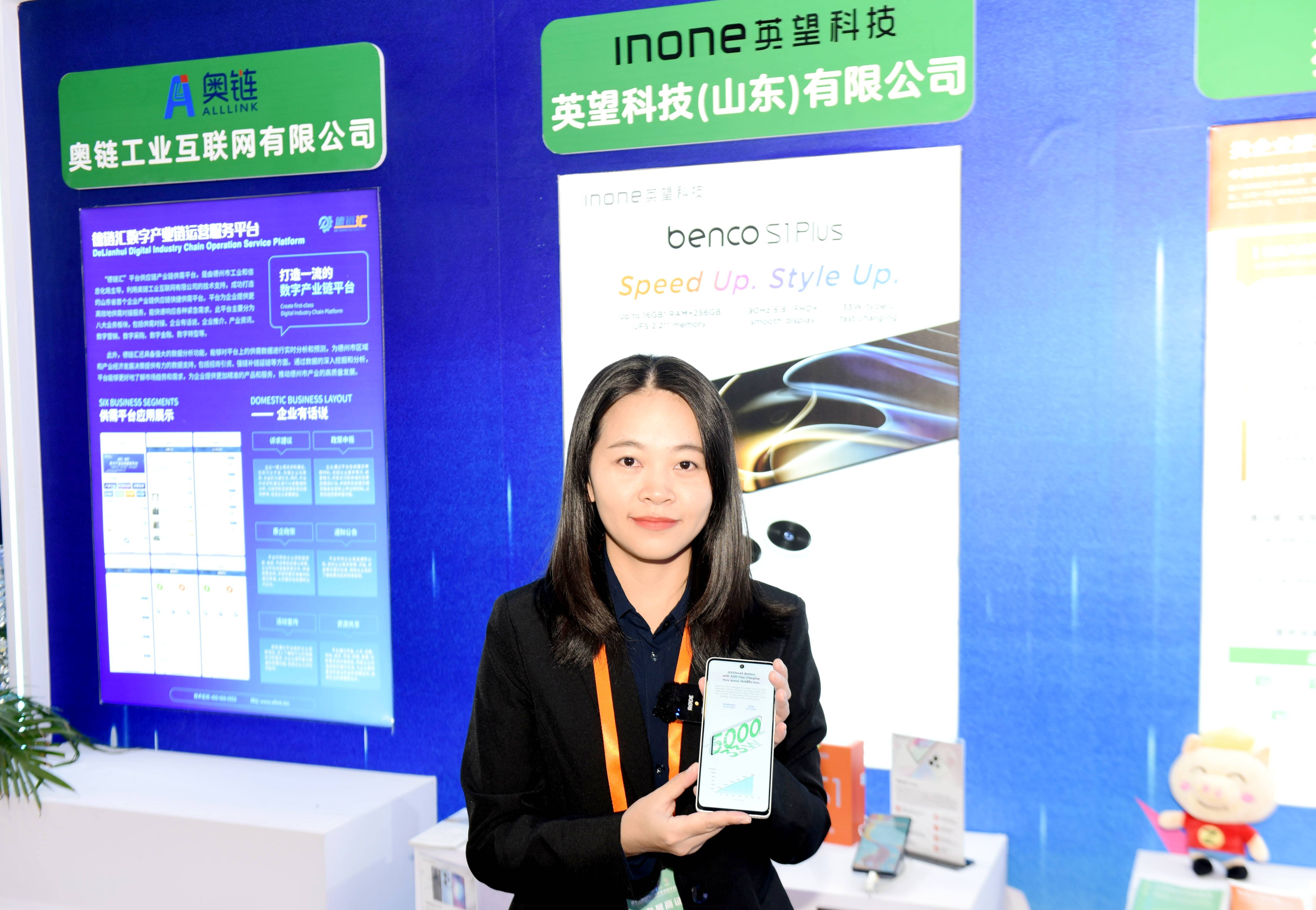 在英望科技(山东)有限公司的展台前,摆放着多种型号的手机,企业市场经理吴康燕向参展客商介绍新推出的手机:“这款新产品亮点是手机的外观,采用了珍珠壳设计,配置也有所提升,增加了外挂芯片,突出了游戏性能。”