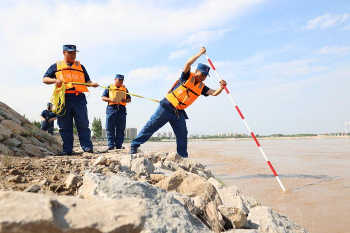 德州黄河河务局齐河黄河河务局管理段党员在黄河调水调沙期间,对根石进行探摸。