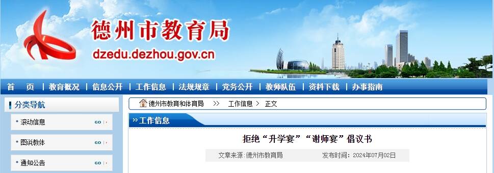 大略网·奏嘛新闻7月2日讯 7月2日,德州市教育局发布拒绝“升学宴”“谢师宴”倡议书。