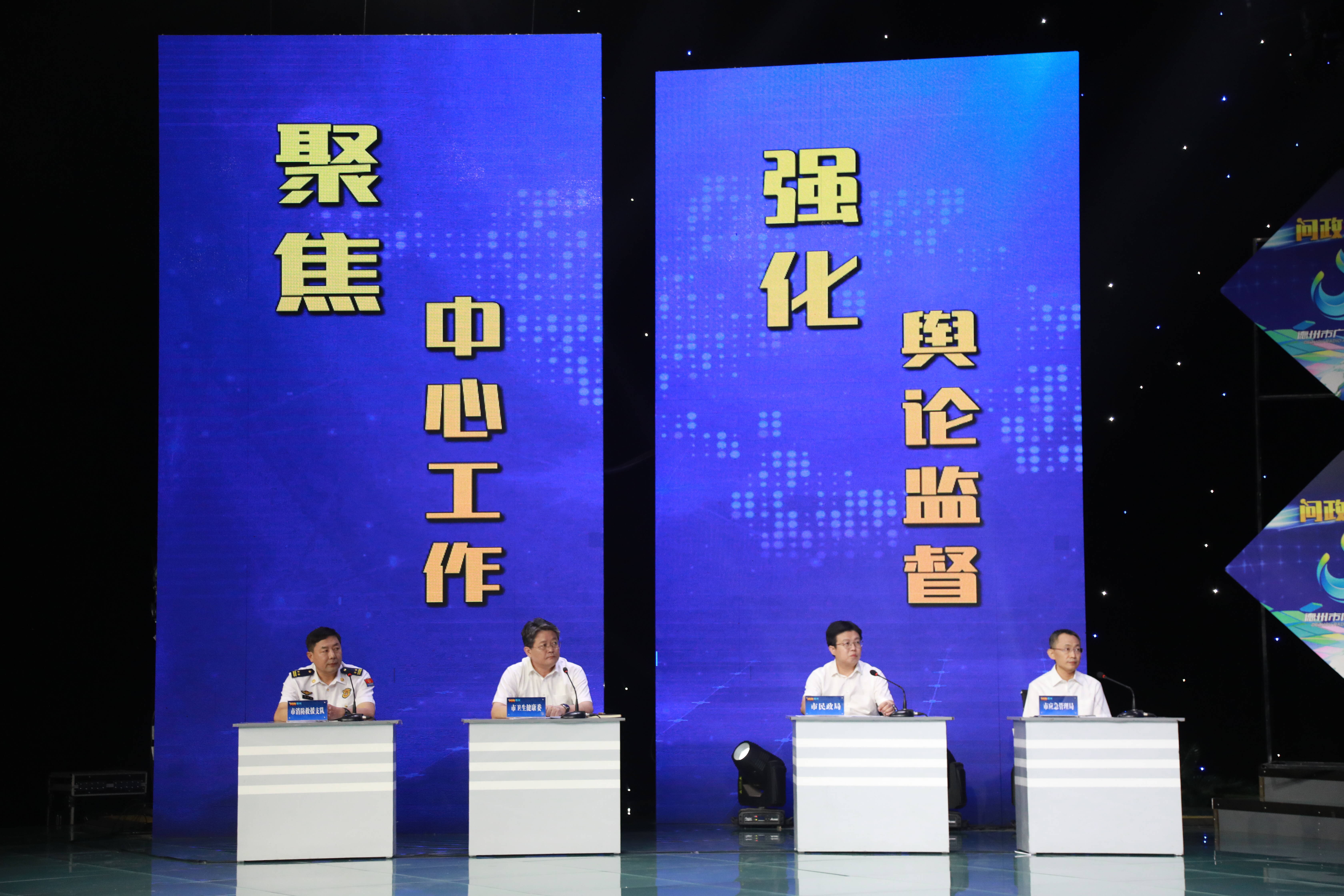 德州市民政局党组书记卢明鹏;市卫生健康委党组书记、主任,市中医药管理局局长周春华;市应急管理局党委委员、副局长张海燕;市消防救援支队支队长杜以营在现场接受问政。