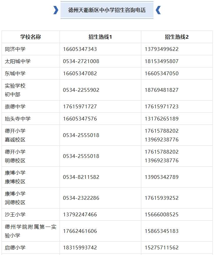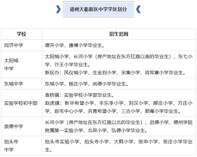 具有天衢新区小学学籍的应届毕业生,依据小学毕业学校,按对口直升方式报名相应初中学校。德开小学、康博小学毕业生到同济中学入学;太阳城小学、长河小学(房产地址在东方红路以南的毕业生)、东七小学、沙王小学、新区办小学毕业生到太阳城中学入学;长河小学(房产地址在东方红路以北的毕业生)、启德小学、德州学院附属第一实验小学、北辰小学、弘德小学毕业生到崇德中学入学;袁桥镇小学毕业生到东城中学入学(实验学校小学部除外);抬头寺镇小学毕业生到抬头寺中学入学;实验学校小学部、赵虎镇小学毕业生到实验学校初中部入学。