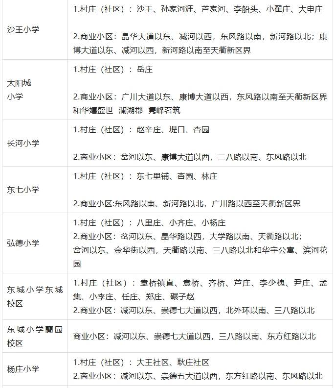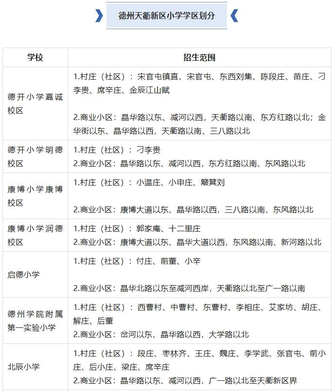 在岔河以东、减河以西购房并长期实际居住人员子女,根据房产所在地,到以下学校入学:东方红路以南到东七小学、沙王小学、杨庄小学就近入学;东方红路以北到启德小学、德州学院附属第一实验小学、北辰小学就近入学。在减河以东购房并长期实际居住人员子女根据房产所在地,按学区划分入学(东城小学除外)。