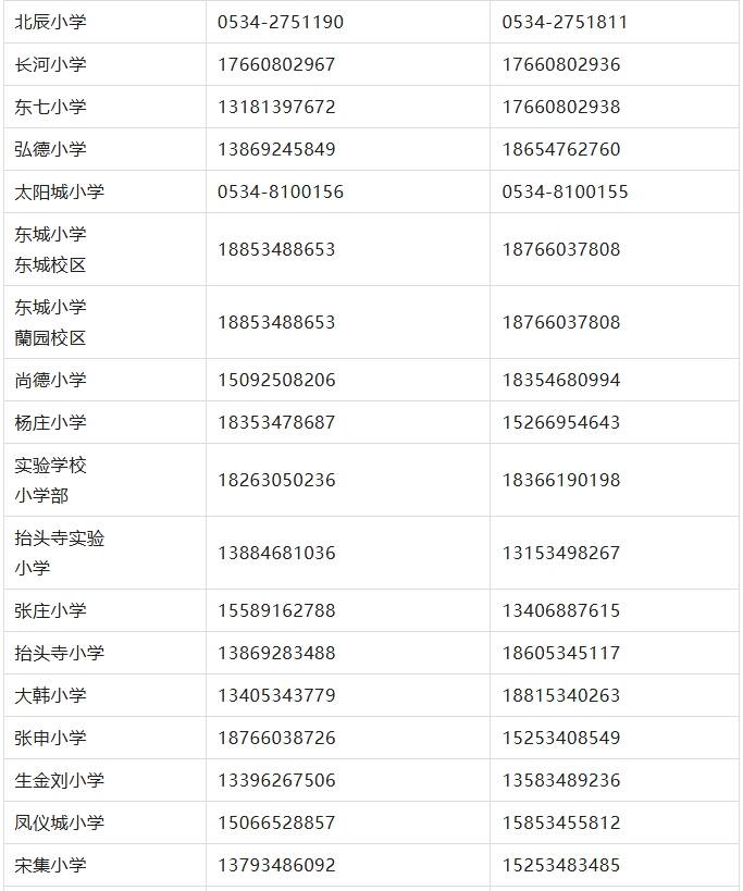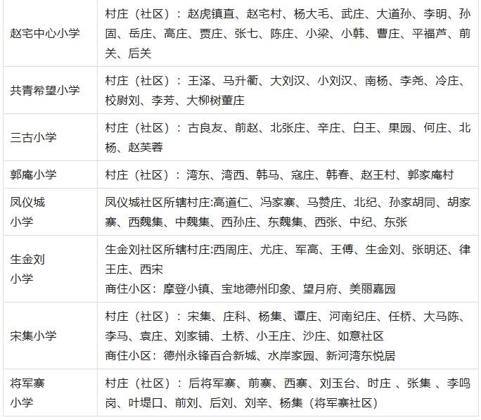 在岔河以东、减河以西外来经商、务工人员子女,根据经商、务工地址,到以下学校入学:东方红路以南到东七小学、沙王小学、杨庄小学就近入学;东方红路以北到德州学院附属第一实验小学、北辰小学就近入学。减河以东外来经商、务工人员子女根据经商、务工地址,到指定学校入学:袁桥镇到杨庄小学、尚德小学、实验学校小学部就近入学;抬头寺镇到抬头寺小学、大韩小学、张申小学、张庄小学就近入学;赵虎镇到新华希望小学、丰乐李小学、刘汉小学、郝庄小学、方庄小学、赵宅中心小学、共青希望小学、三古小学、郭庵小学就近入学;新区办到凤仪城小学、生金刘小学、宋集小学、将军寨小学就近入学。