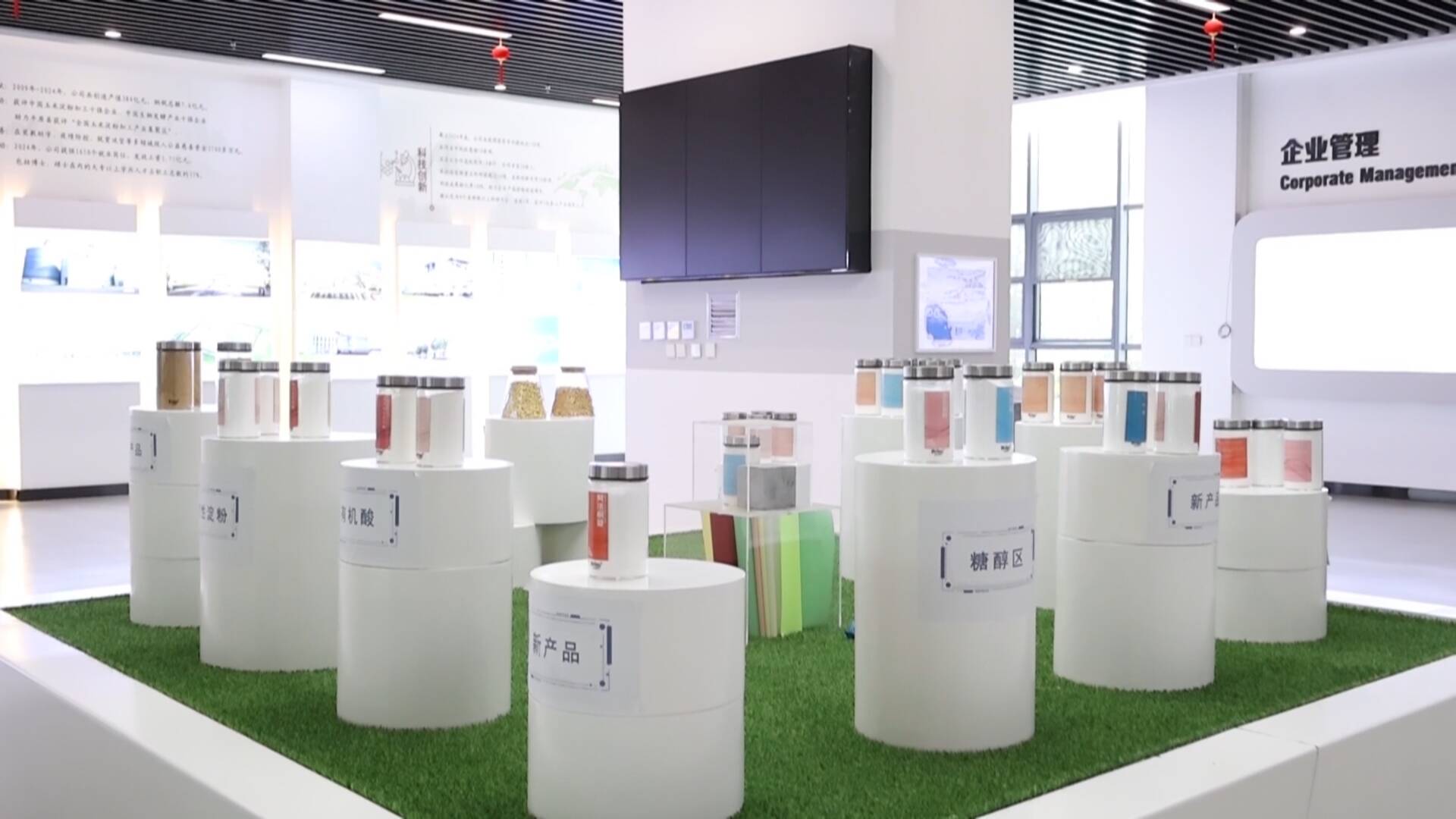 在福洋生物的展厅,这些琳琅满目的产品,都和玉米有关,玉米中淀粉含量约为70%,作为黄金产业链上的起点,这些淀粉经过初加工和深加工可以应用到像食品、洗护品和建材等多个领域。