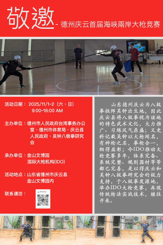 为进一步深化两岸同胞交流交往,挖掘并弘扬中华传统文化精髓,德州市依托深厚的文化底蕴与资源优势,将举办2025 海峡两岸八极拳技艺交流大会暨首届大枪对抗赛与海峡两岸(德州)大禹文化交流活动,届时邀您共赴文化之约、共享运动激情。
