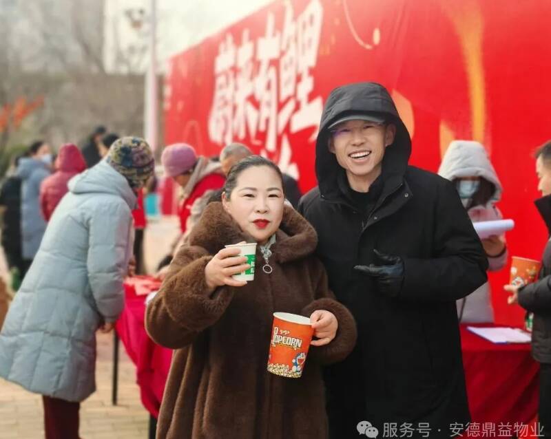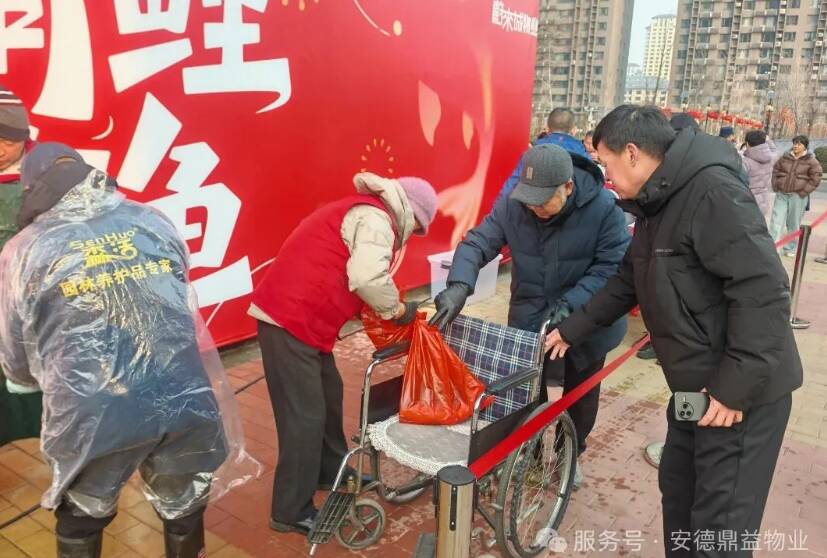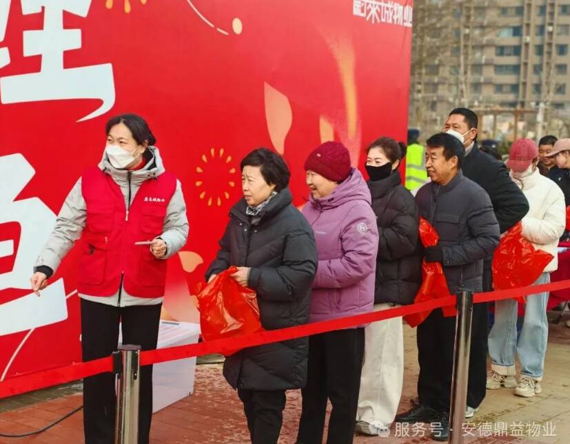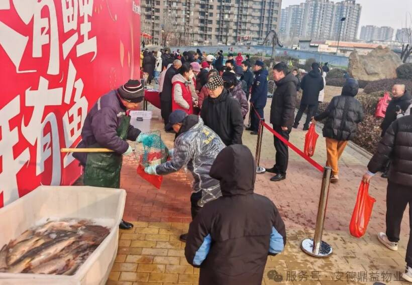 活动现场人头攒动、暖意融融。业主们有序排队,物业工作人员分工协作、快速高效,核对信息、装袋递鱼、贴心提醒,全程流畅有序,更有热饮为业主们驱散冬日的寒冷。