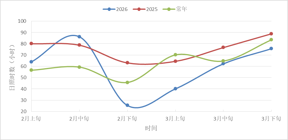 2月上旬和下旬日照时数较去年及常年均偏少,中旬偏多,但整体2月日照时数较去年及常年均偏少。3月日照时数较去年和常年均偏少,3月下旬日照时数75.6小时,较去年偏少13.2小时,较常年偏少7.9小时。入春以来日照较去年偏少,接近常年,杨柳树养分积累放缓。