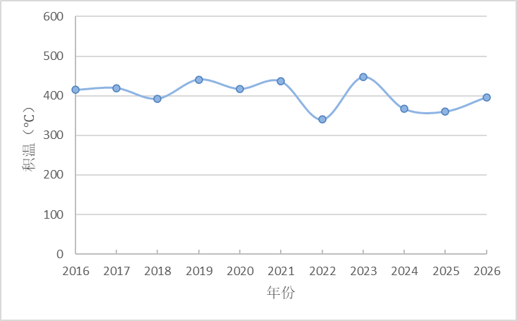 图3 德城区近10年1月1日至3月31日≥0℃有效积温年际变化