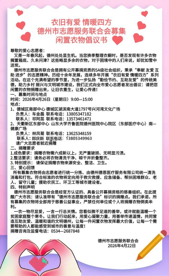 德州市志愿服务联合会是拥有公开募捐资质的5A级社会组织,秉承“奉献 友爱 互助 进步”的志愿精神。历经十余年发展,连续多年开展“衣旧有爱 情暖四方”系列活动。在这个充满希望的季节里,为进一步弘扬“勤俭节约、互助友爱”的传统美德,助力乡村振兴与文明城市建设,我们正式向全市爱心志愿者发出倡议:请把您闲置的衣物捐赠出来,让旧衣重生,让爱心传递!