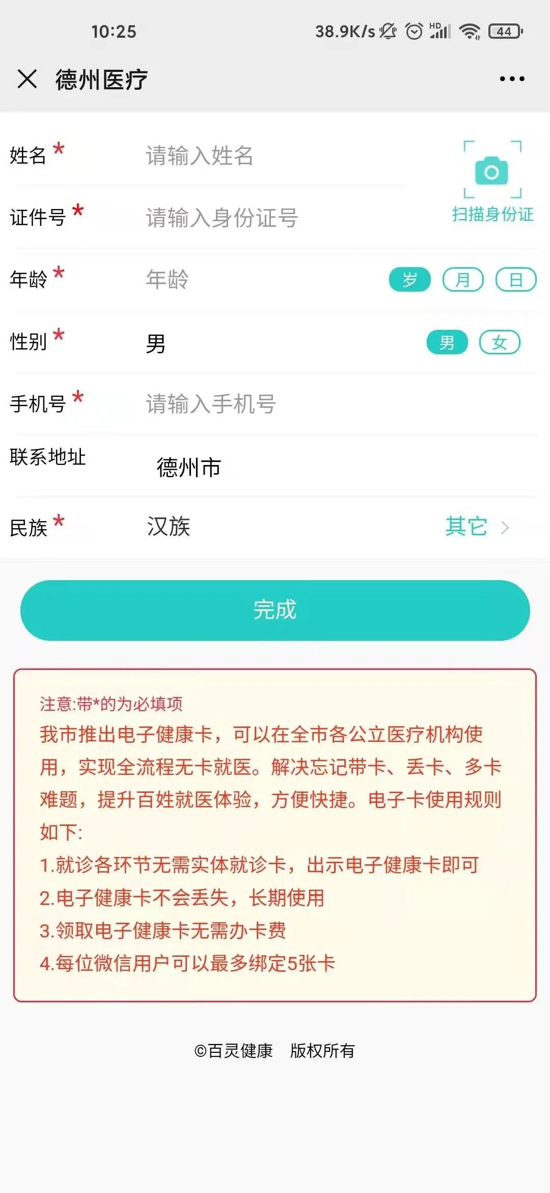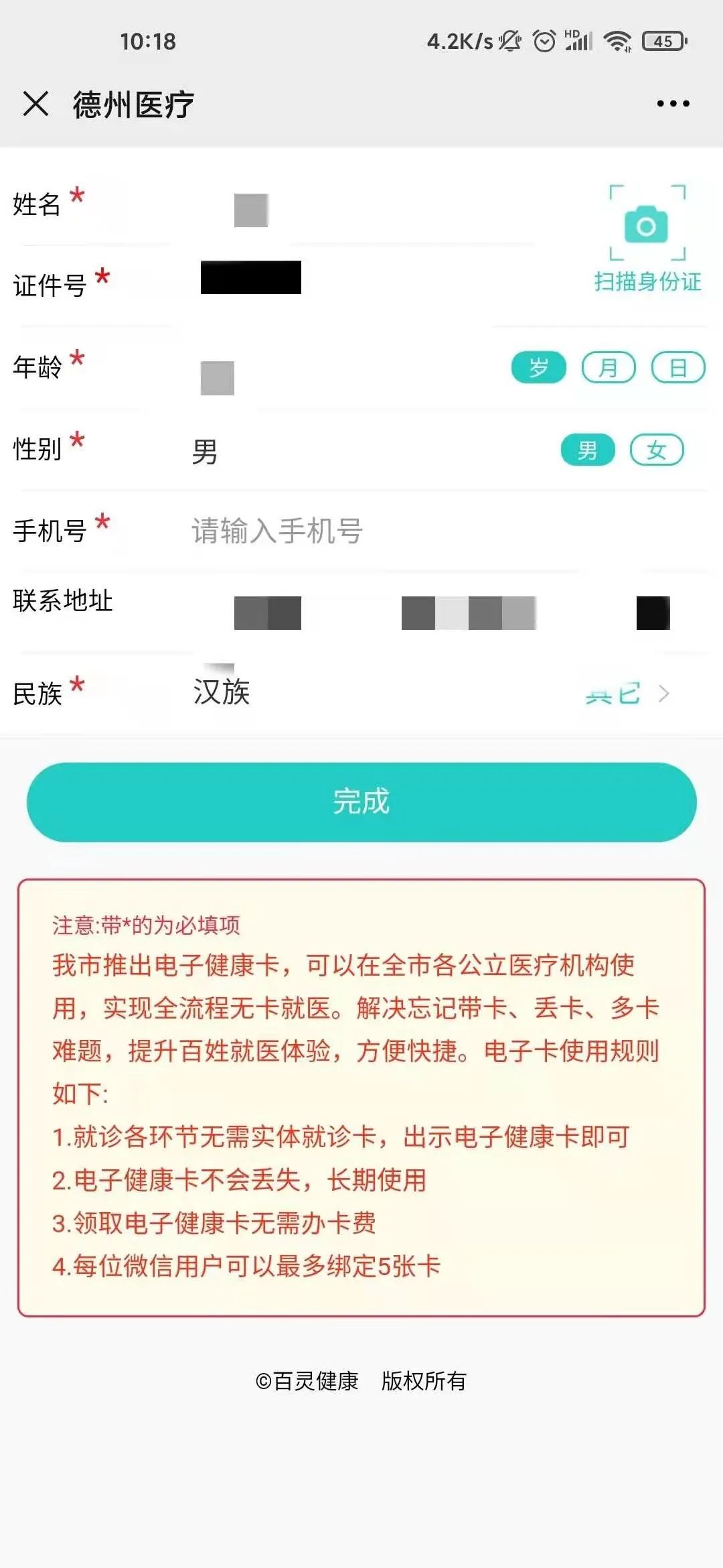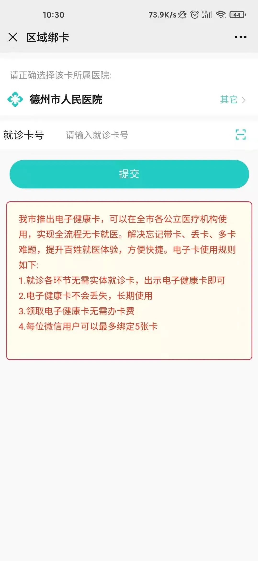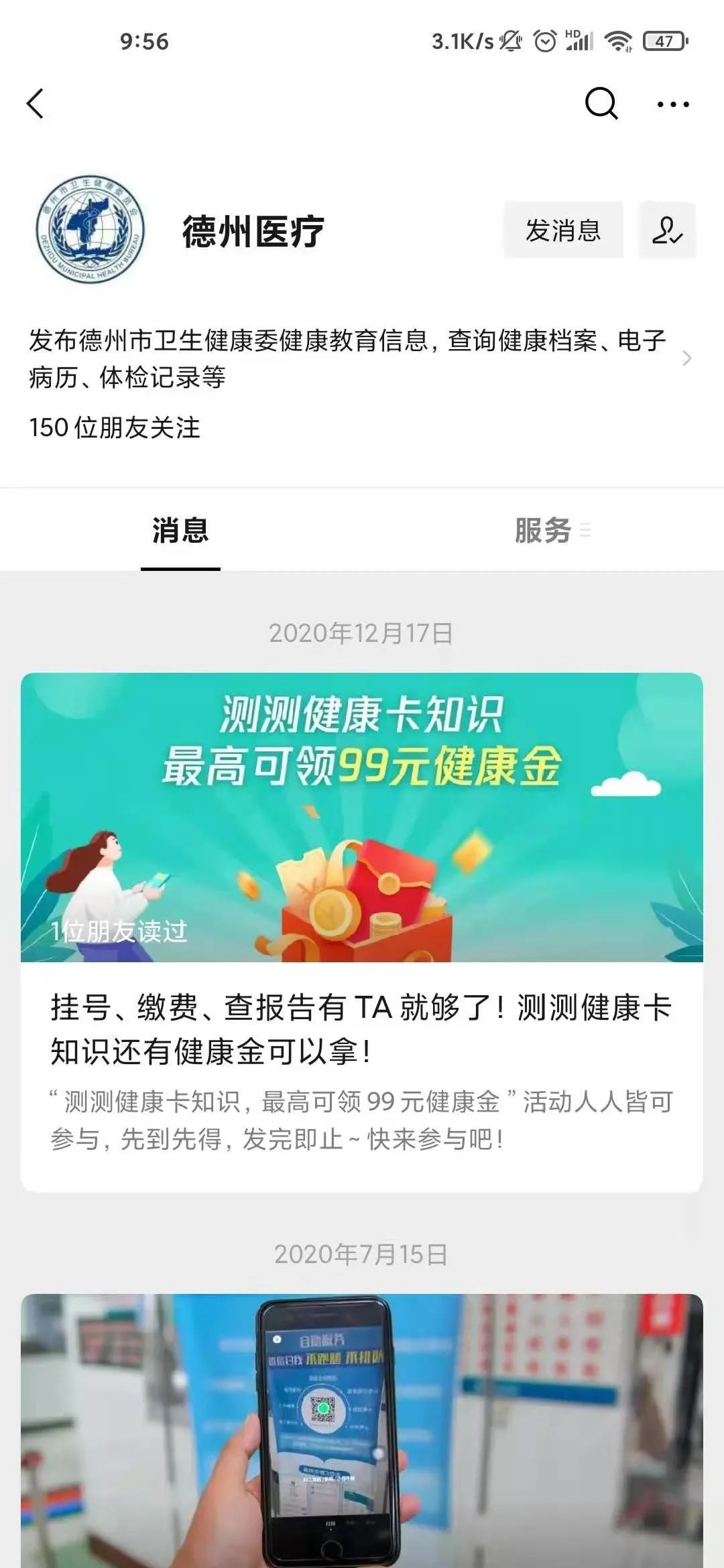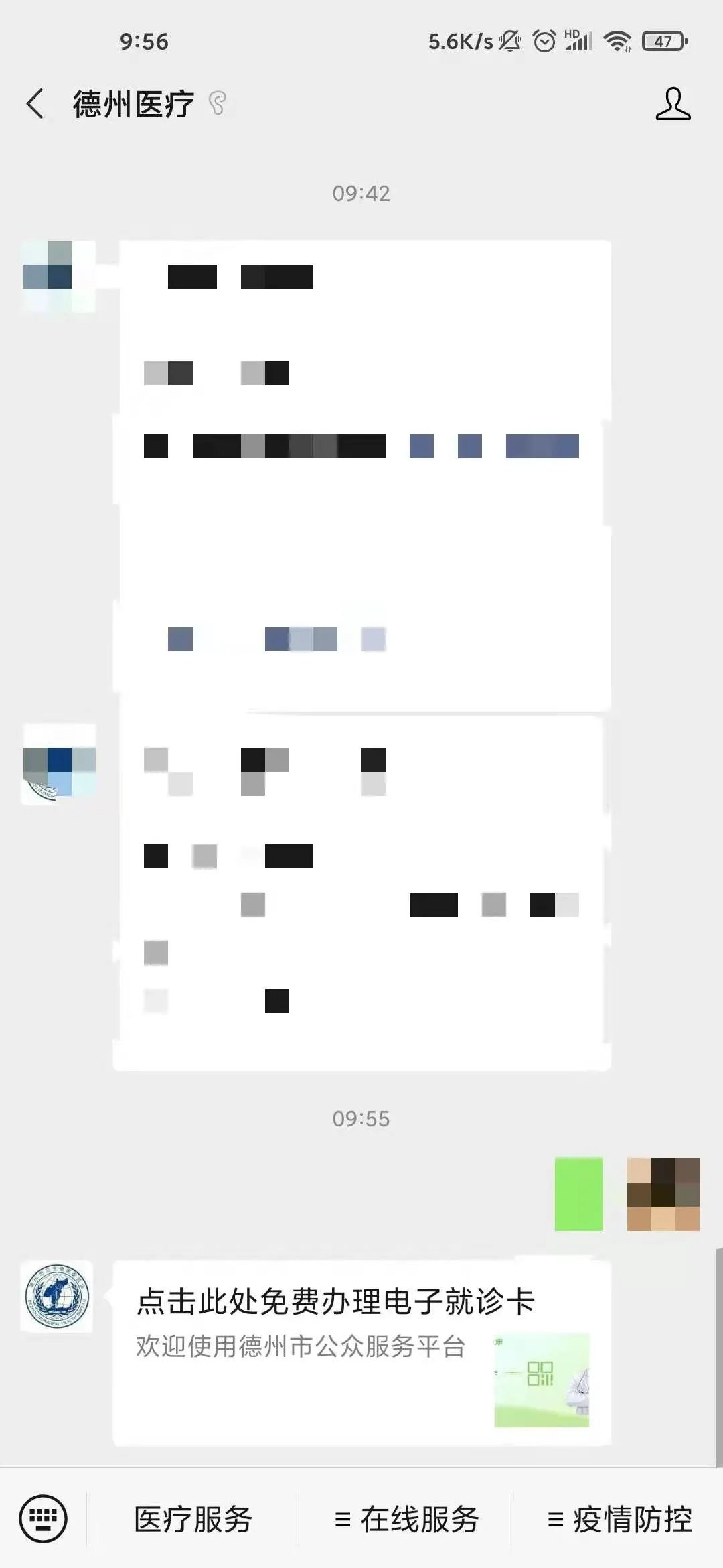 关注并进入“德州医疗”公众号后,系统会自动为您推送一条信息点击免费办理电子健康卡: