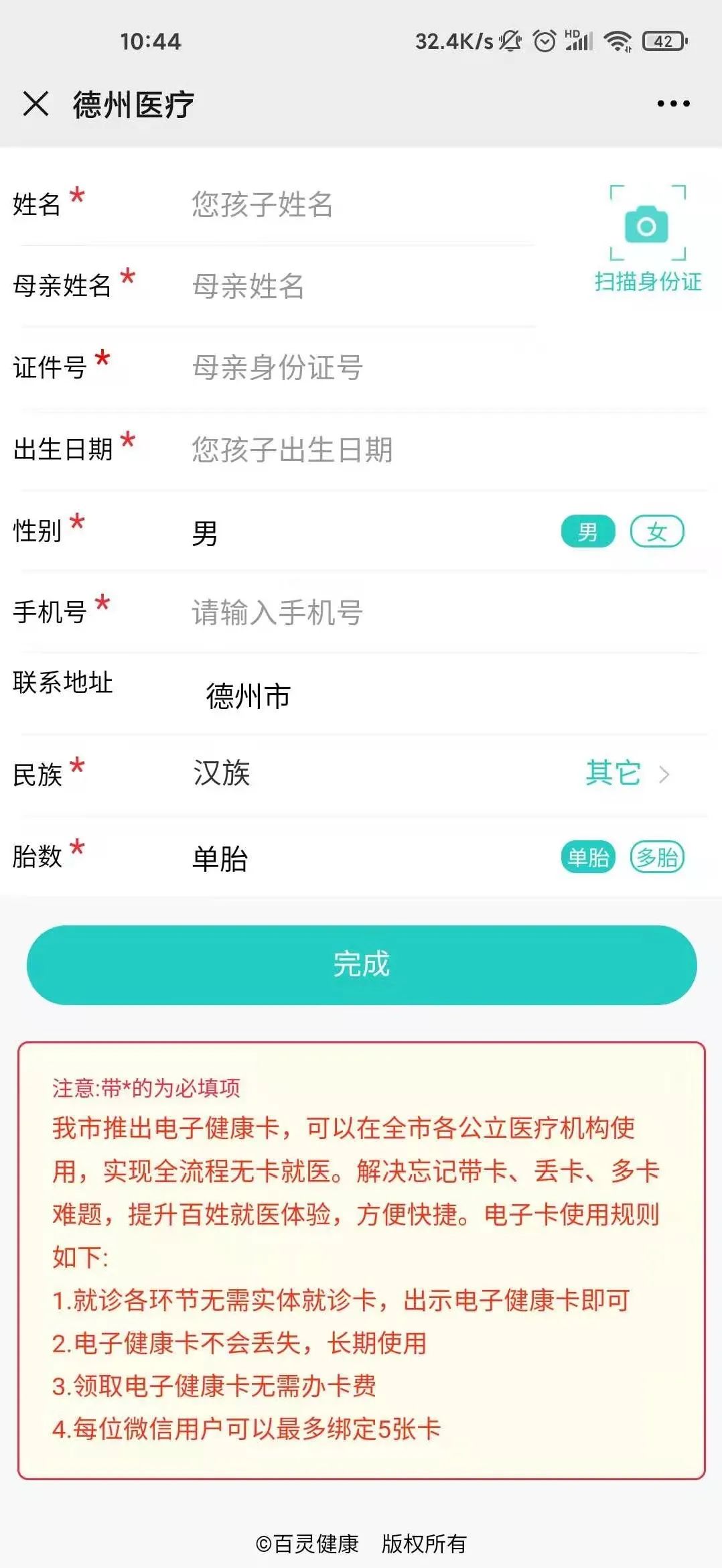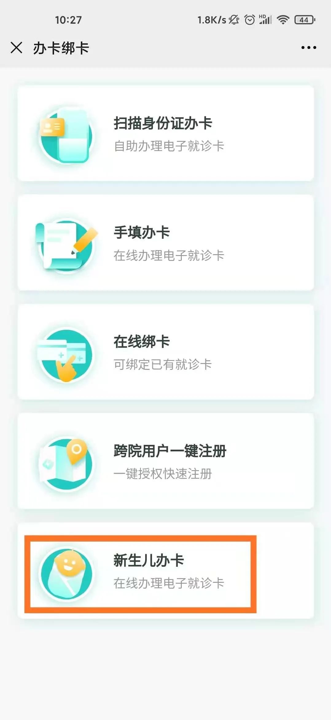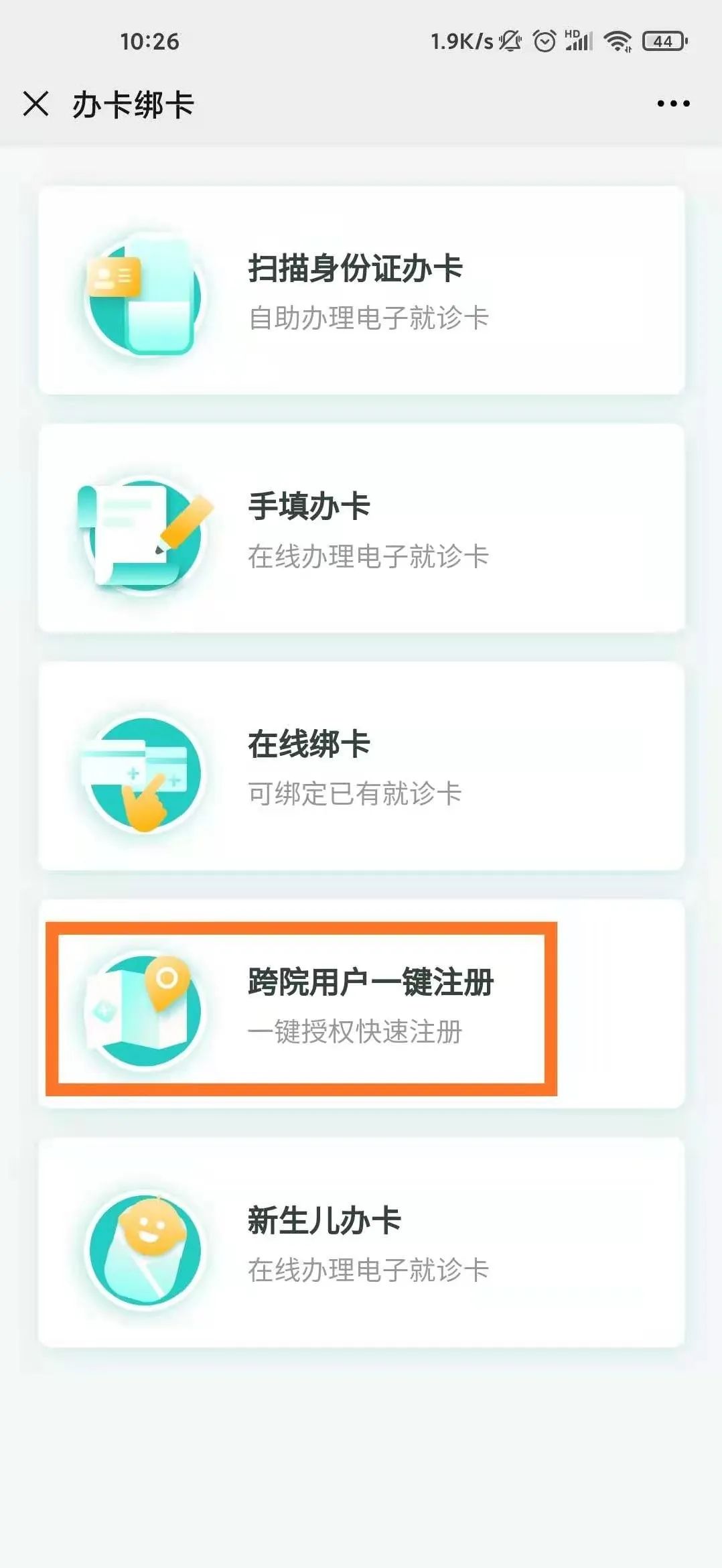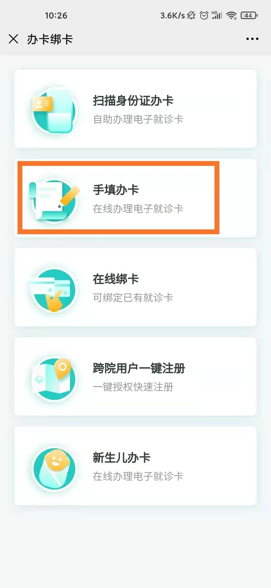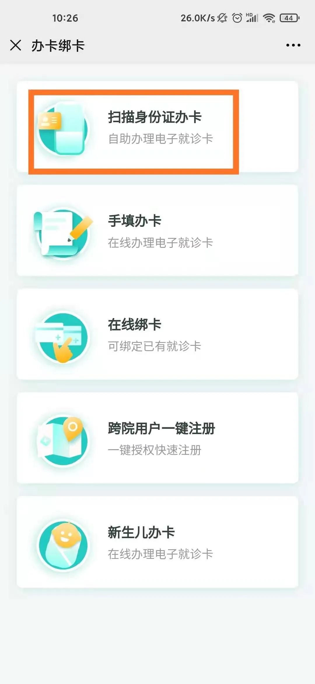 目前公众号提供五种办卡方式,扫描身份证办卡、手填办卡、在线绑卡、跨院用户一键注册、新生儿办卡。