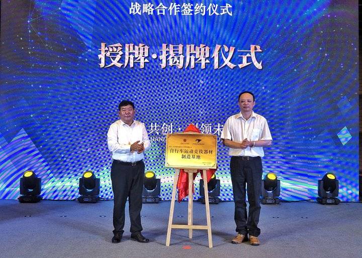 山东省政府办公厅副主任张连三、中国自行车运动协会秘书长孙为民共同为“中国自行车运动协会战略合作伙伴”揭牌。泰山瑞豹复合材料有限公司是泰山体育产业集团全资子公司,泰山体育拥有完备的高端复合材料研发、制造、检测体系和多年开发、制造经验的技术骨干队伍,现已建成全国最大的高端碳纤维自行车研发生产基地。泰山瑞豹成立十一年来,专注于专业运动自行车研发生产以及自行车文化的推广普及,产品获得国际自行车联盟三大认证,其中疲劳检测标准远高于国际标准,打破了欧美国家在这一领域的百年垄断。近年来,又斩获“中国优秀工业设计金奖”、“IF国际设计大奖”等荣誉奖项,并与中国自行车运动协会、铁三协会达成战略合作。