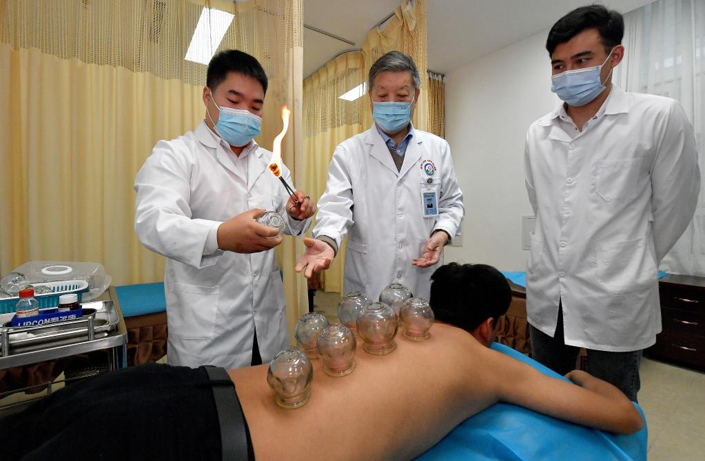 2020年11月10日,陕西中医药大学针灸推拿学院教授贾成文(中)在指导马文轩(右)进行拔罐。新华社记者 刘潇 摄