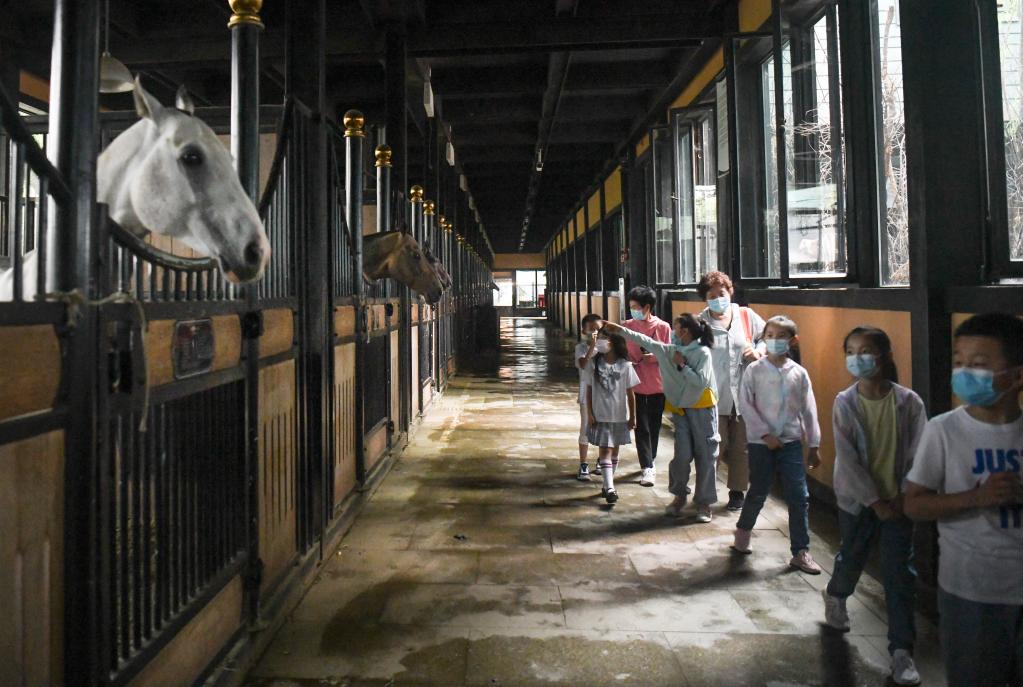 在新疆古生态园汗血马基地,几名小朋友在导游的介绍下观察汗血马(2022年6月16日摄)。新华社记者 王菲 摄