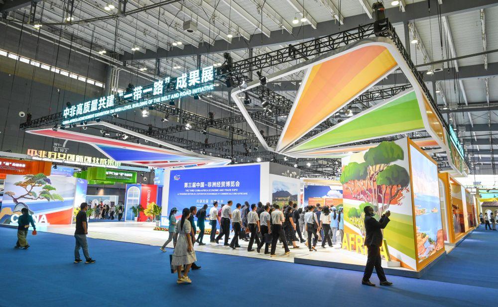 △2023年6月29日,中国长沙国际会展中心,第三届中非经贸博览会参会嘉宾参观中非高质量共建“一带一路”成果展。