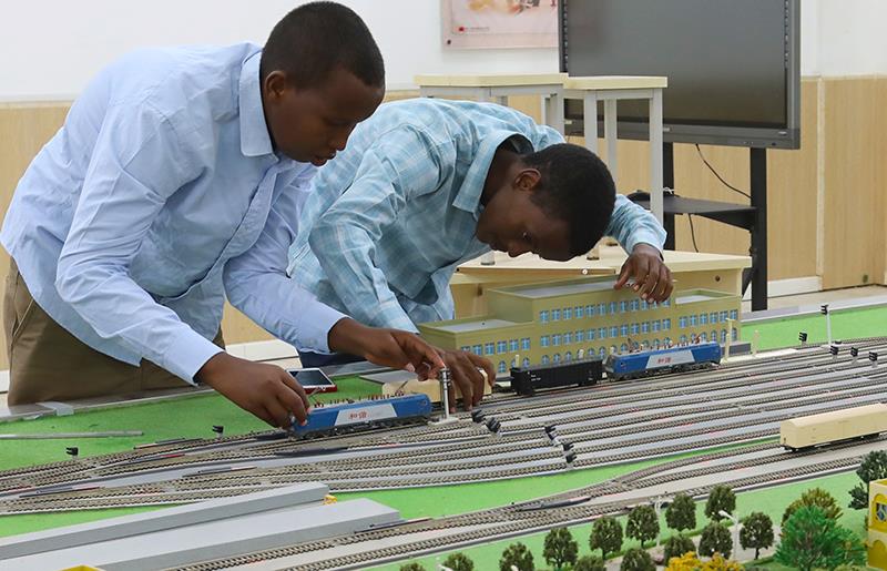 △2022年9月19日,在位于吉布提首都吉布提市的吉布提工商学校,学生在鲁班工坊铁道运营沙盘教学区学习。