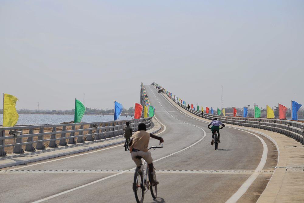 △2022年1月16日,人们骑车通过位于塞内加尔方久尼市、由中国公司承建的方久尼大桥。