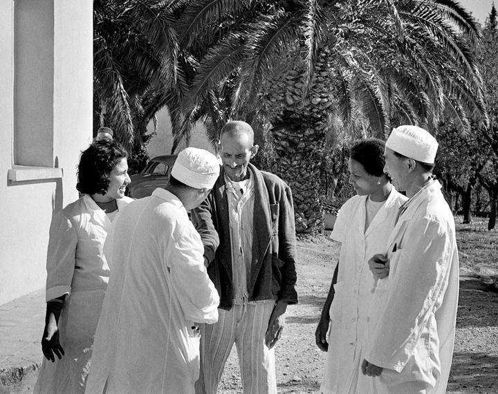 △1966年12月,一名阿尔及利亚老人向中国援非医疗队医生表达自己病况好转的愉快心情。