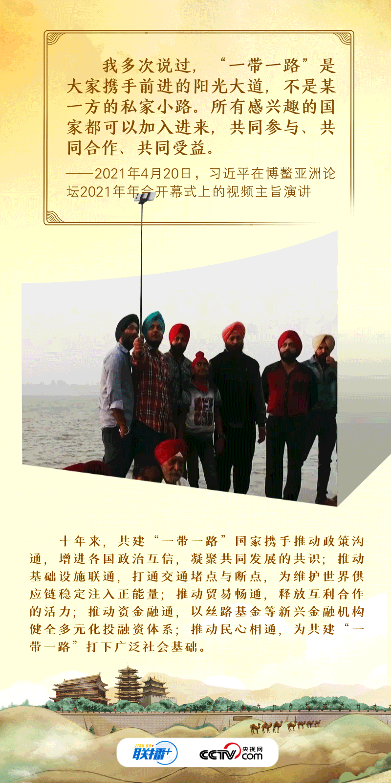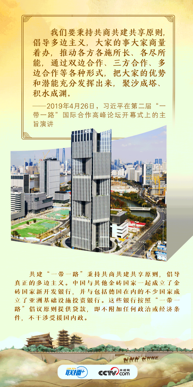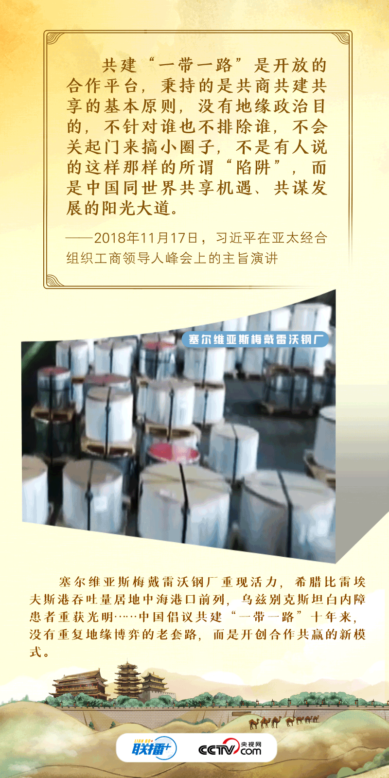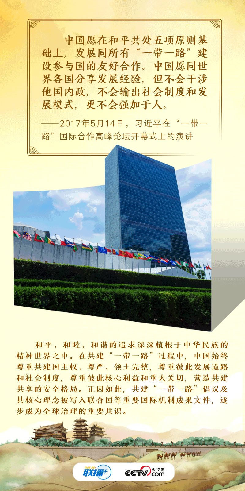 丨联播+丨“古丝绸之路绵亘万里、延续千年,积淀了以和平合作、开放包容、互学互鉴、互利共赢为核心的丝路精神。”2017年,习近平主席在首届“一带一路”国际合作高峰论坛开幕式上系统阐述了丝路精神的内涵,倡议将“一带一路”建成和平之路。