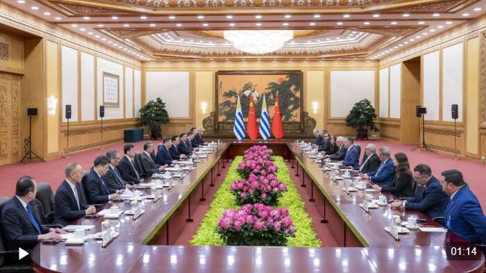 奥尔西说:“尊敬的习近平主席阁下,乌拉圭高度重视此次对华国事访问,这也体现在我们派出了很高级别的代表团。今天恰逢两国建交38周年,两国的全面战略伙伴关系正处于历史最好时期。乌方有意进一步深化双方在各领域的合作。”