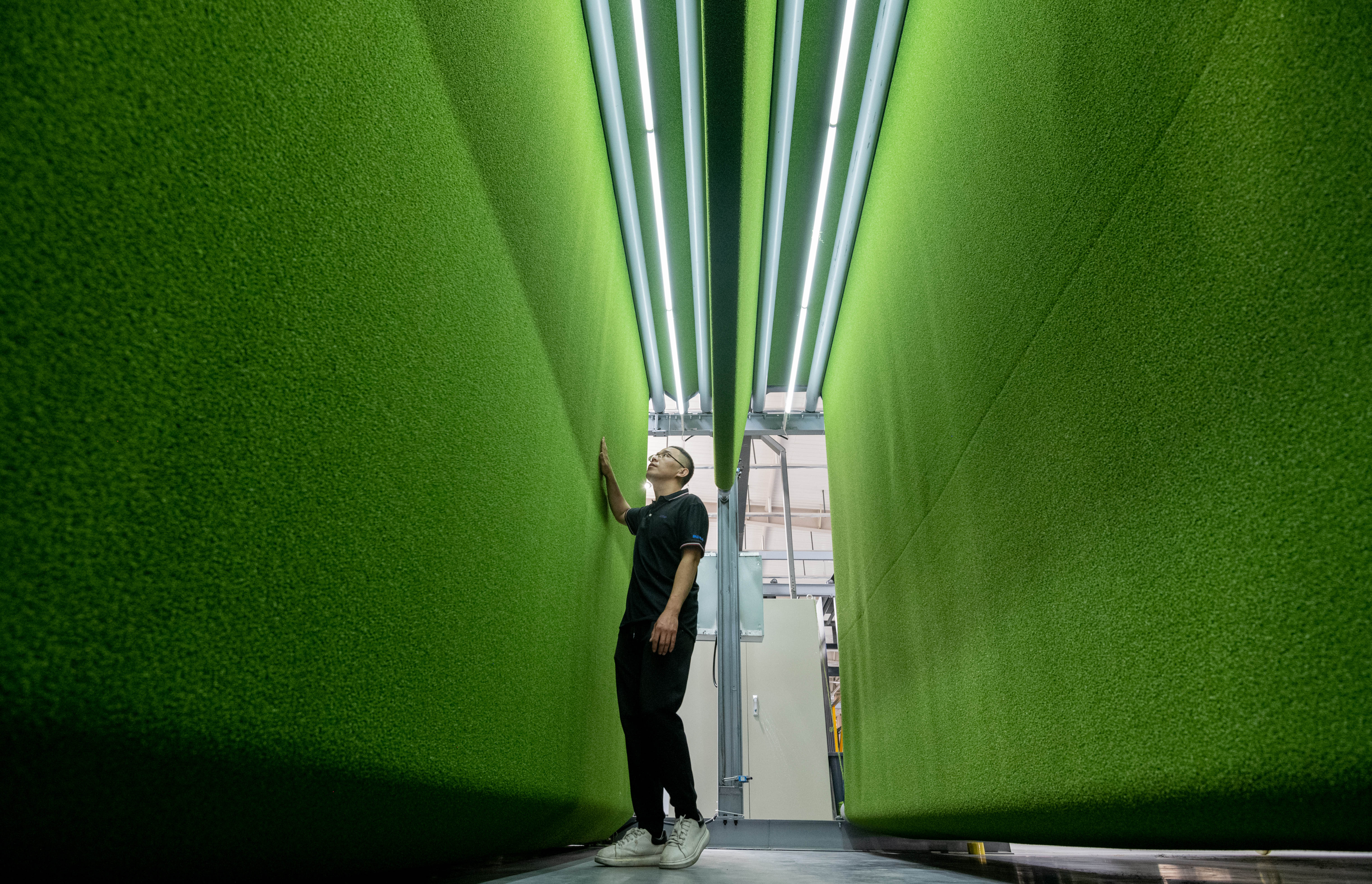 在山东省乐陵市泰山体育产业集团人造草坪智能化生产车间,工人在检测产品。新华社记者 范长国 摄
