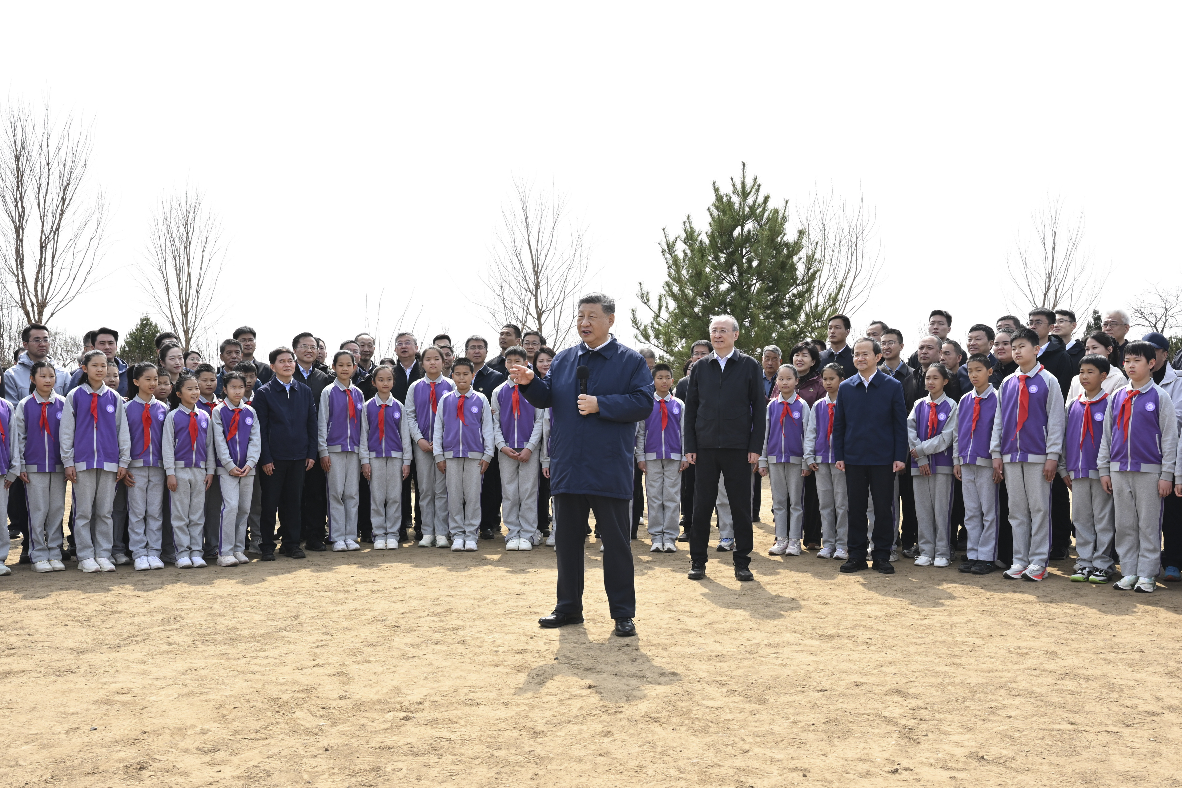 3月30日,党和国家领导人习近平、李强、赵乐际、王沪宁、蔡奇、丁薛祥、李希等来到北京市昌平区百善镇参加首都义务植树活动。这是习近平同在场的干部群众、少先队员亲切交谈。