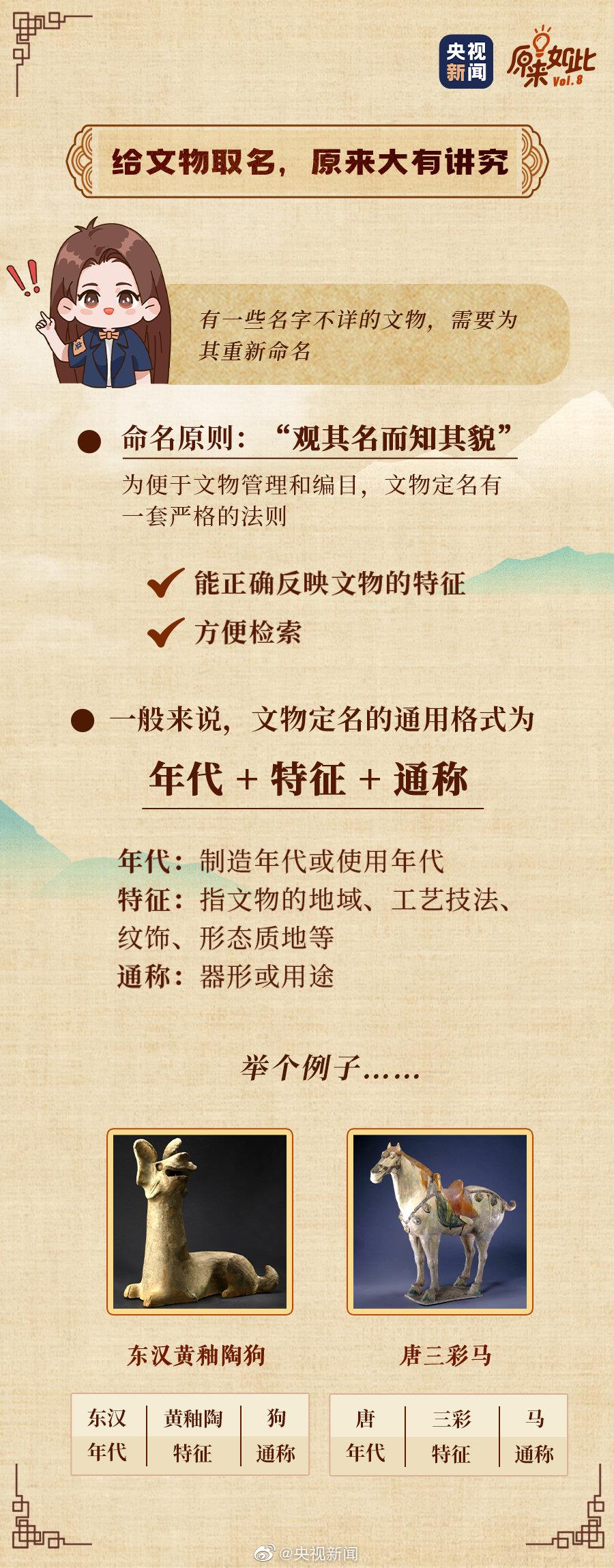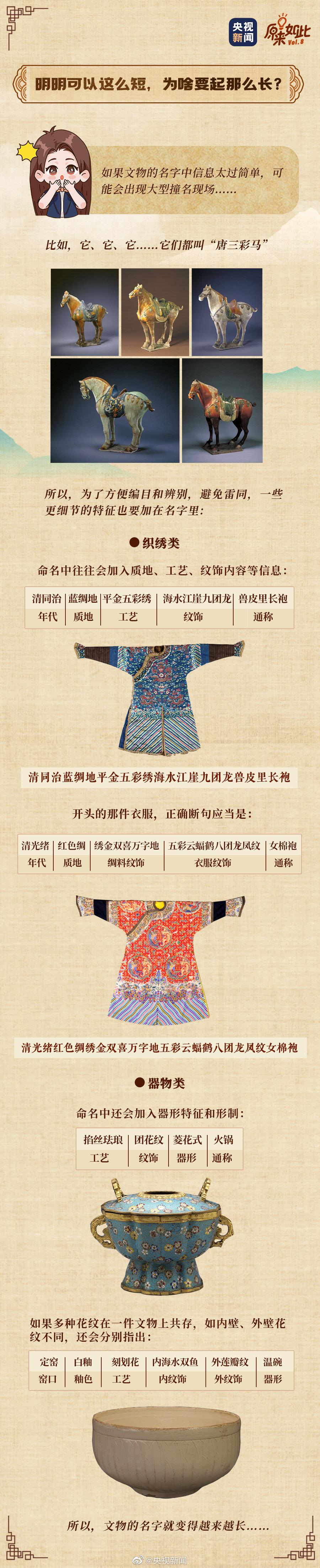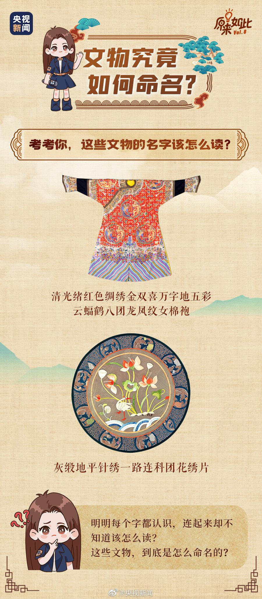 “清光绪红色绸绣金双喜万字地五彩云蝠鹤八团龙凤纹女棉袍”“灰缎地平针绣一路连科团花绣片”……给文物起名,既要体现特征,也要方便检索。为避免“撞名”,还会加入工艺、纹饰等信息,名字就越来越长。戳图↓学习文物知识!
