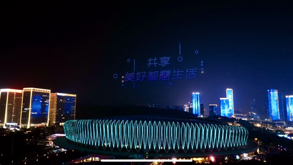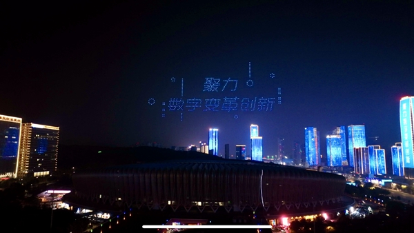 活动中,千机秀编队有序起飞,以“数据蓝色大海”为映衬,色彩斑斓的无人机灯光点亮泉城夜空……“聚力数字变革创新,共享美好智慧生活”“数字强省,数字山东”“办事轻松,更爱山东”等字样飞跃而出,与楼宇灯光秀的巨幅字样深情凝望。继而,山东省各市城市地标剪影勾勒而成的数字化星球从夜幕飞出,还有探索太空的太空人等也出现在无人机编队表扬中,一个个华彩篇章,共同记录下齐鲁大地与数字化变革的浪漫约会……