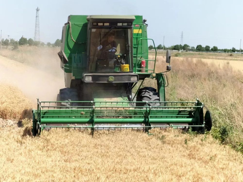 在山东省滨州市无棣县水湾镇王化如村,收割机正在麦地进行作业。新华社记者 高天 摄
