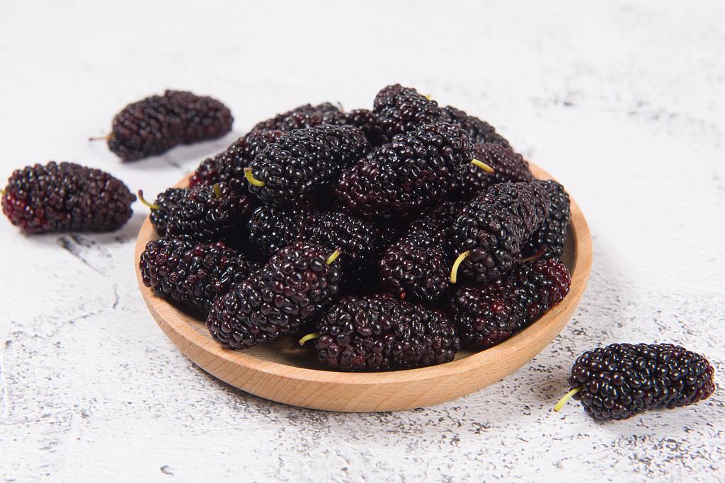 桑葚的膳食纤维含量在水果中属于优秀水平,其不溶性膳食纤维含量高达4.1g/100g,同为浆果的蓝莓总膳食纤维含量为2.4g/100g。