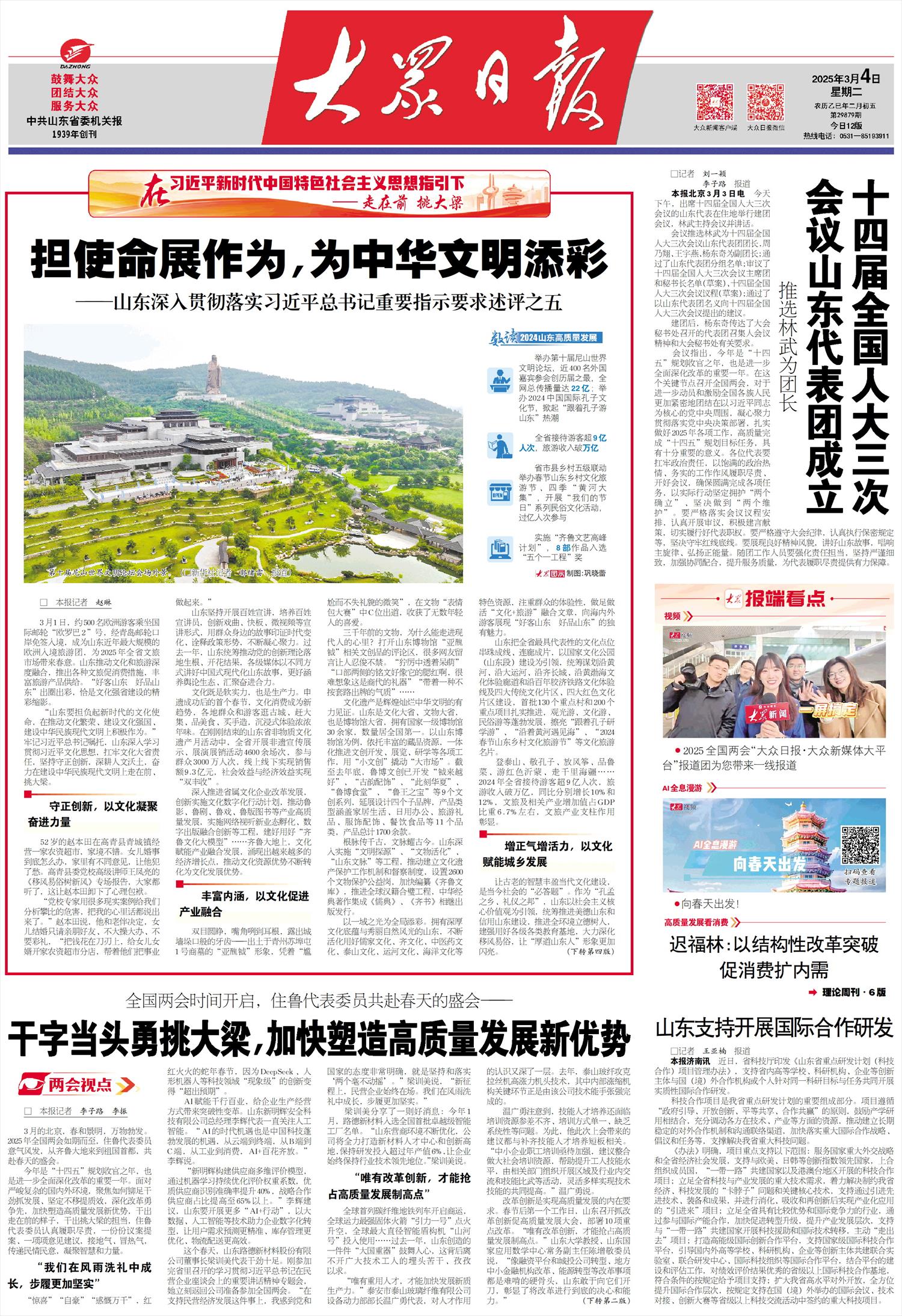 会议指出,今年是“十四五”规划收官之年,也是进一步全面深化改革的重要一年。在这个关键节点召开全国两会,对于进一步动员和激励全国各族人民更加紧密地团结在以习近平同志为核心的党中央周围,凝心聚力贯彻落实党中央决策部署,扎实做好2025年各项工作,高质量完成“十四五”规划目标任务,具有十分重要的意义。各位代表要扛牢政治责任,以饱满的政治热情、务实的工作作风履职尽责、开好会议,确保圆满完成各项任务,以实际行动坚定拥护“两个确立”、坚决做到“两个维护”。要严格落实会议议程安排,认真开展审议,积极建言献策,切实履行好代表职权。要严格遵守大会纪律,认真执行保密规定等,坚决守牢红线底线。要展现良好精神风貌,讲好山东故事,唱响主旋律、弘扬正能量。随团工作人员要强化责任担当,坚持严谨细致,加强协同配合,提升服务质量,为代表履职尽责提供有力保障。