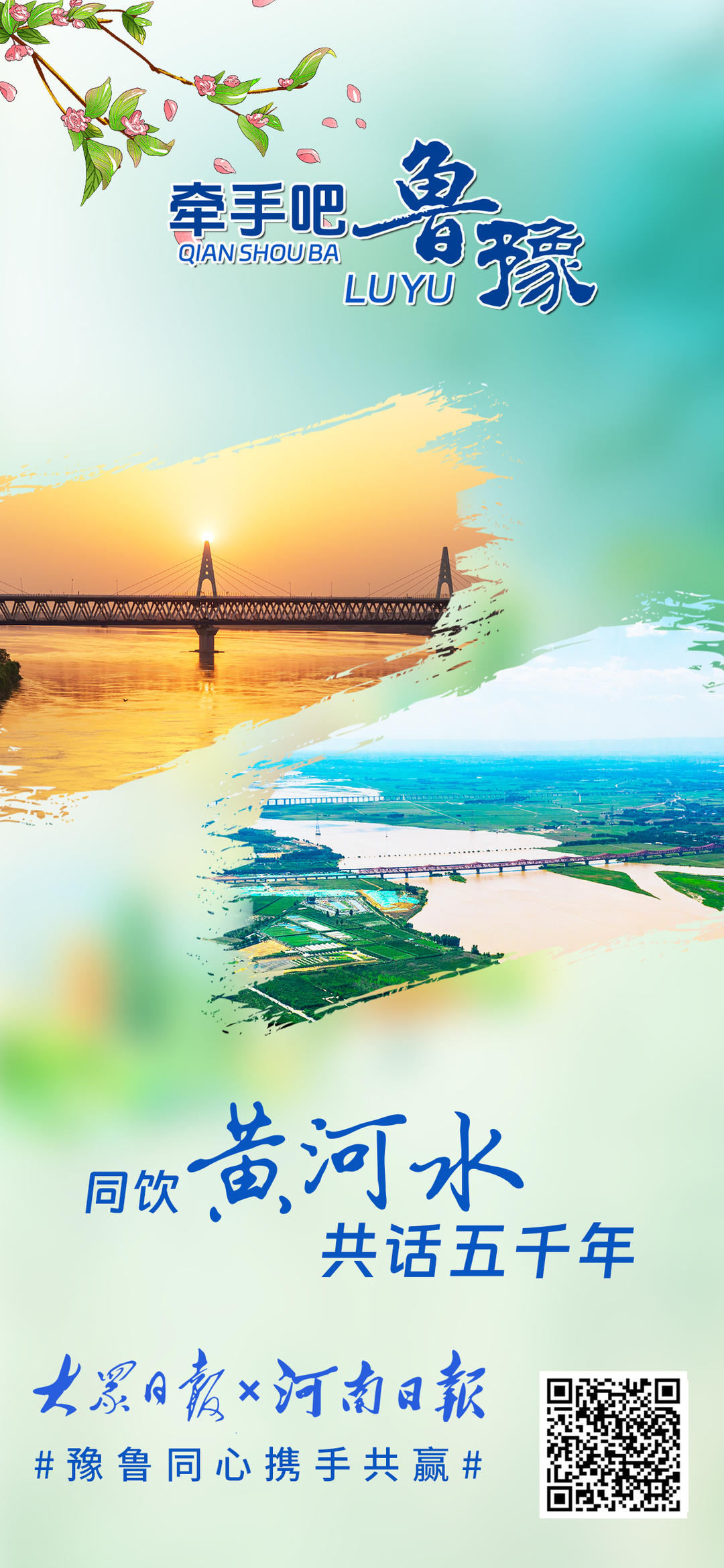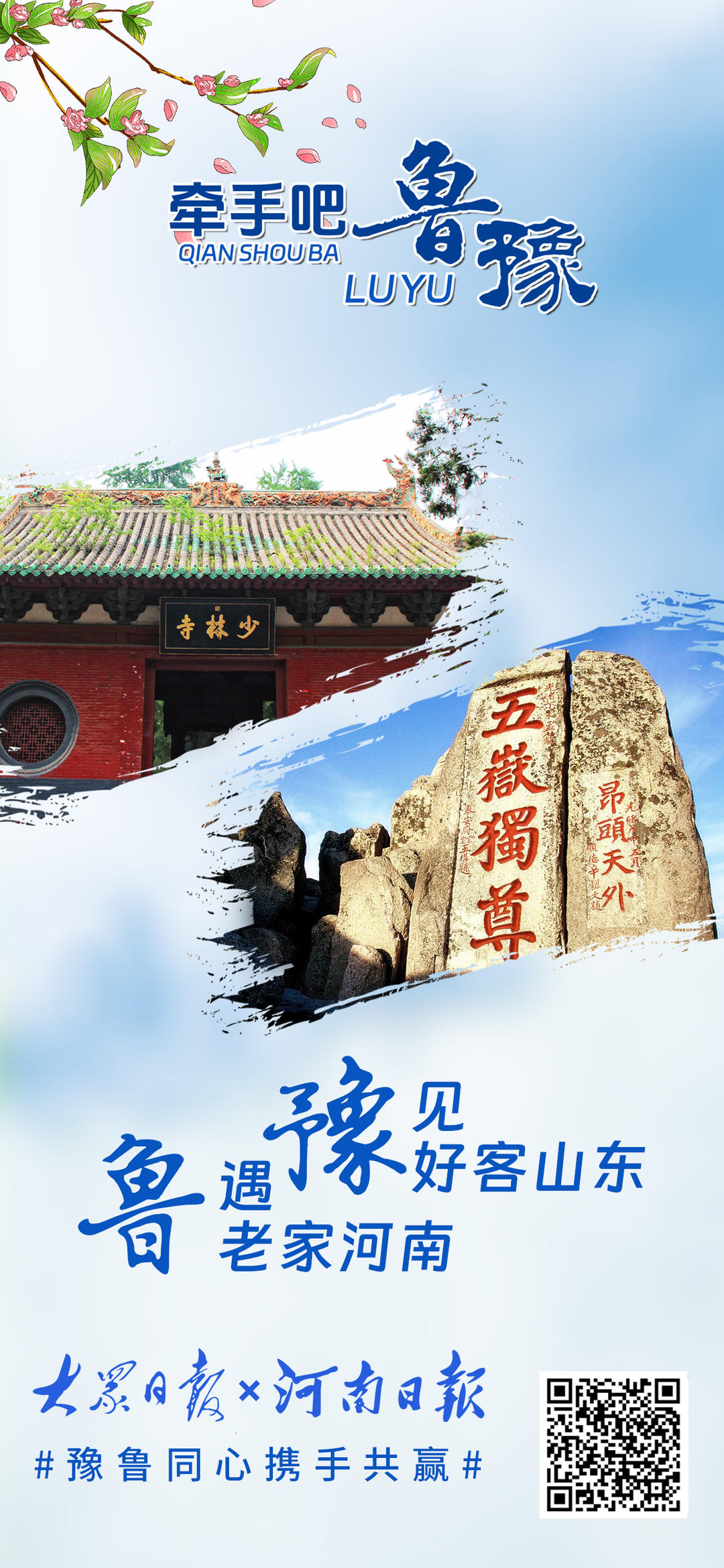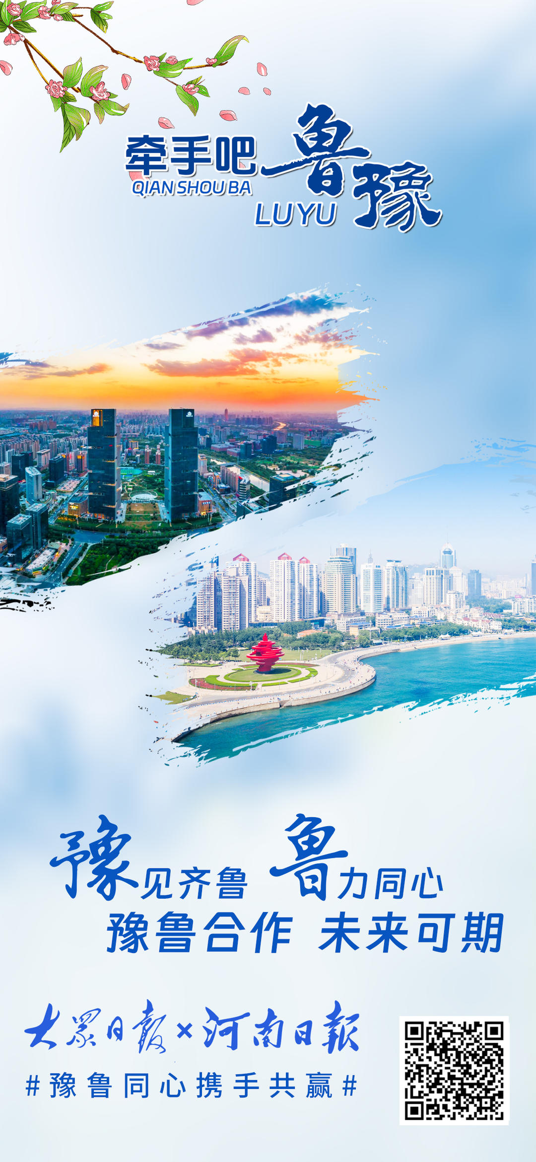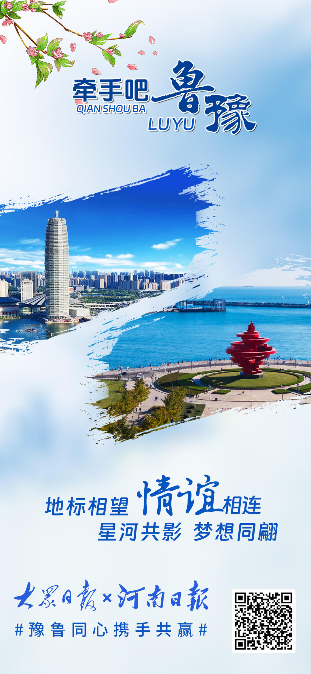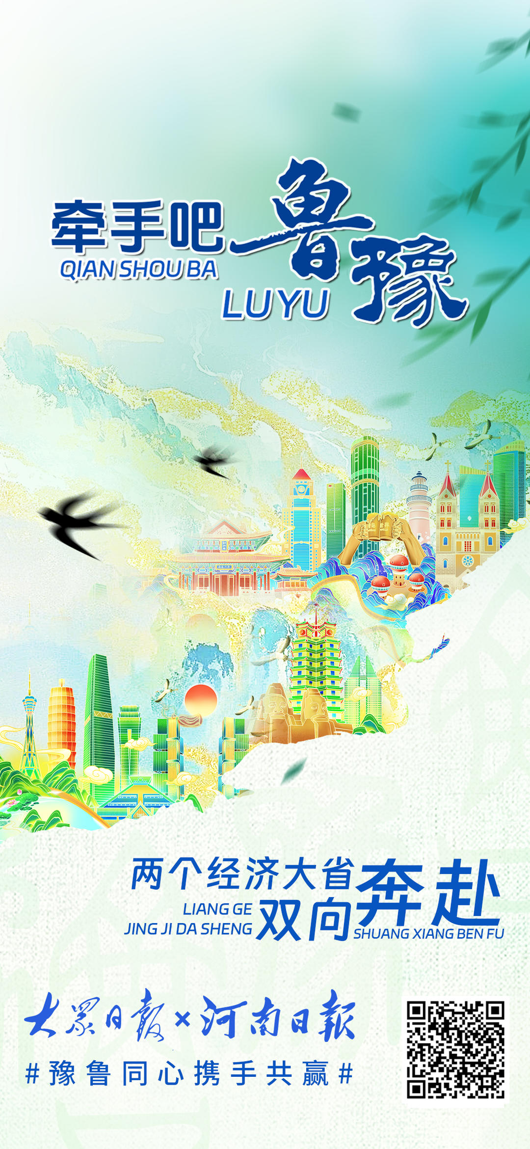 黄河奔流,五千年文明滋养鲁豫大地,孕育两地深厚底蕴。从甲骨文到《论语》,文化交融心心相印;从济郑高铁、日兰高铁贯通到创新智造突破,鲁豫携手领跑新时代。少林寺与泰山相望,烩面与煎饼飘香,牡丹与荷花共绽芬芳。地标相映,情谊相连,鲁豫合作未来可期。