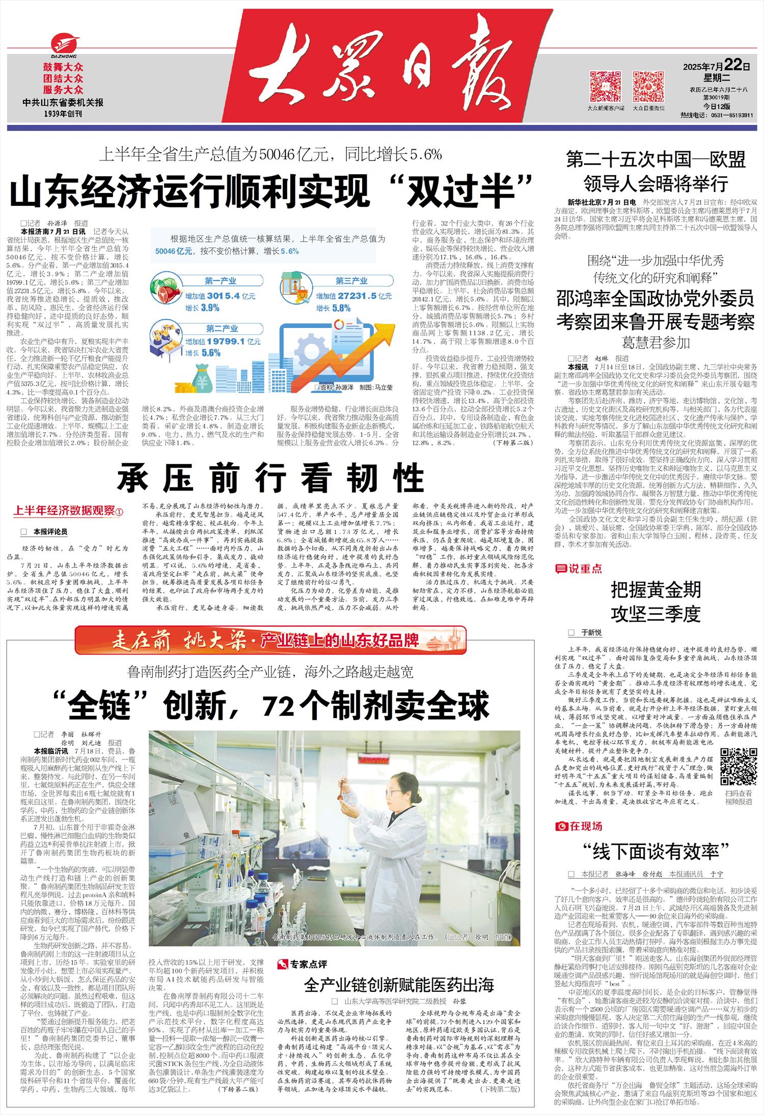 在鲁南厚普制药有限公司十二车间,只闻中药香却不见工人。这里既是生产线,也是中药口服制剂全数字化生产示范技术平台,数字化程度高达95%,实现了药材从出库—加工—称量—投料—提取—浓缩—醇沉—收膏—定容—乙醇回收全生产流程的自动化控制,控制点位超8000个。而中药口服液灭菌STICK条包生产线,为全自动液体条包灌装设计,单条生产线灌装速度为660袋/分钟,现有生产线最大年产能可达3亿袋以上。“我们创新解决了玻璃瓶包装存在易破碎、儿童用药危险性大、吸药不顺畅等缺陷,年销售额突破7个亿。”鲁南厚普制药有限公司生产主管魏国才说。