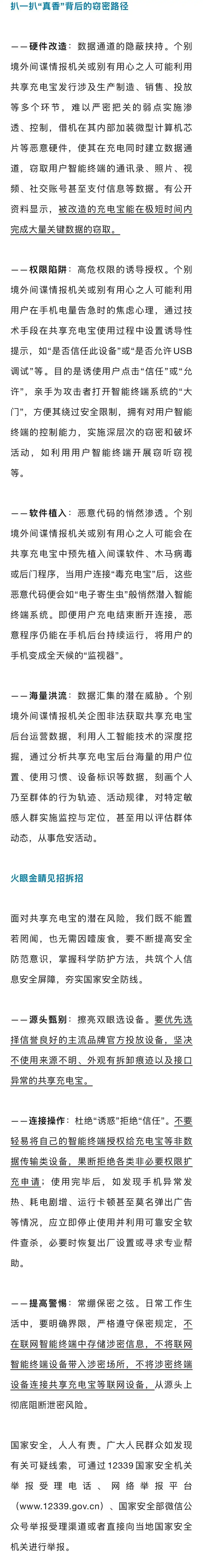 出门在外,手机电量低于50%感觉比失恋还心慌!共享充电宝,当代都市人的“赛博续命丹”,插上数据线安全感瞬间拉满。但万万没想到,罪恶的黑手居然伸向了这小小的“救命稻草”。工作发现,有境外间谍情报机关和别有用心之人借此窃取公民个人隐私甚至国家秘密。使用充电宝要有科学的防护方法,在方便使用的同时,要多一份安全防护意识。