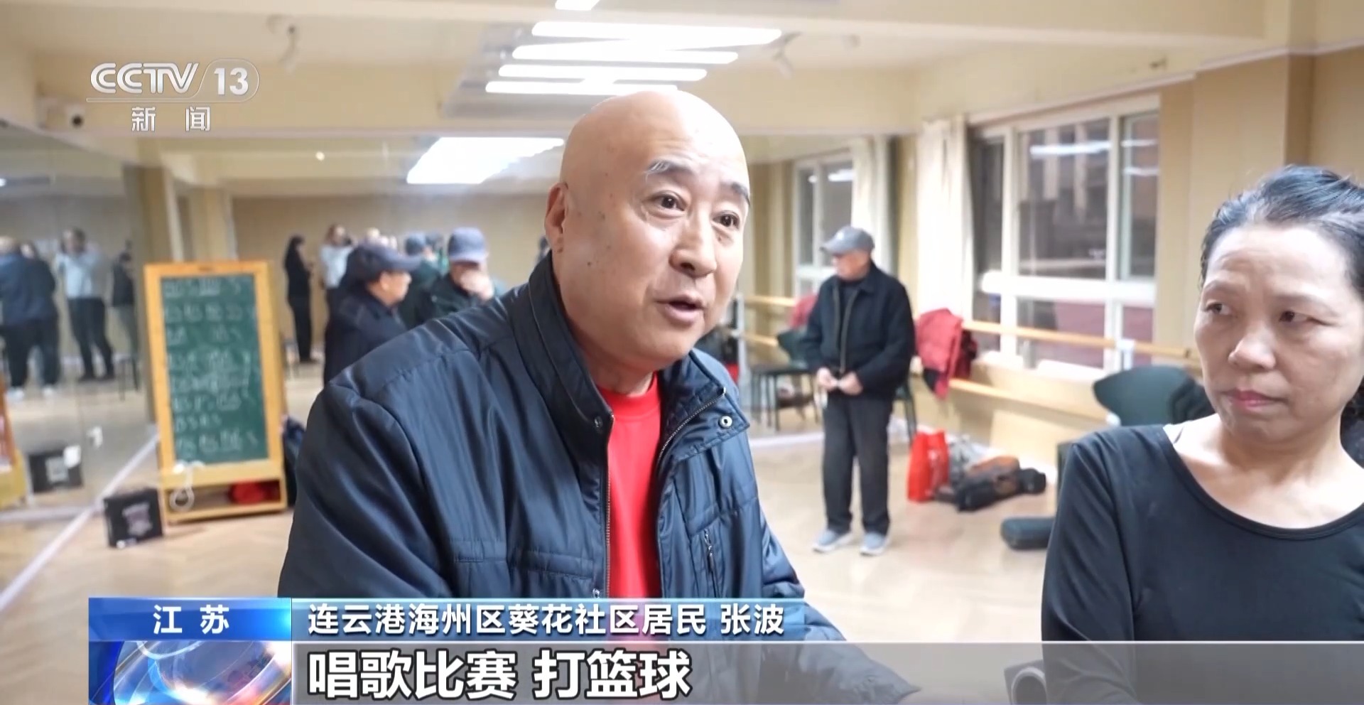 连云港海州区葵花社区居民 张波:我不光在这里活动,老年大学我经常去,唱歌、比赛、打篮球,这个对我来讲非常好,你看我身体很棒。